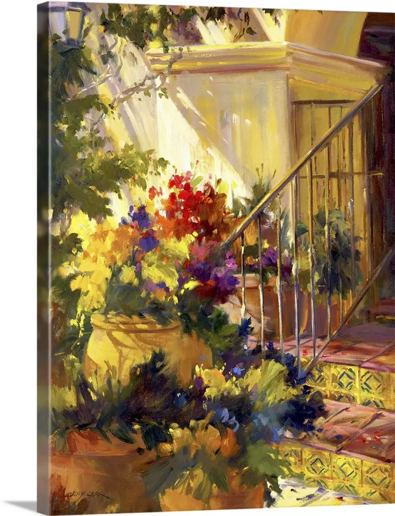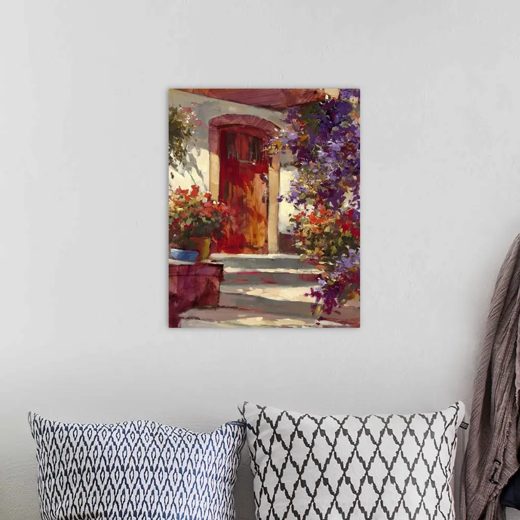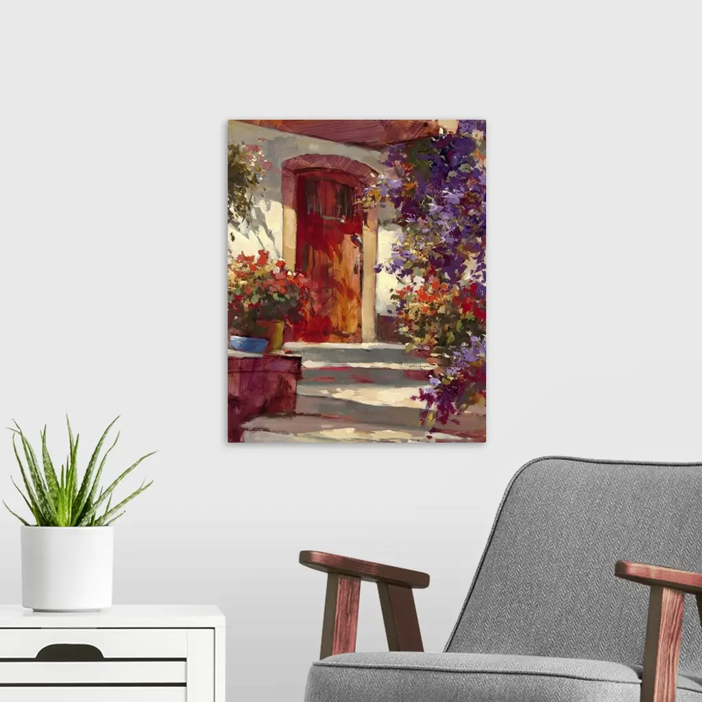 Contemporary painting of a village house front door, with vibrant flowers all around.