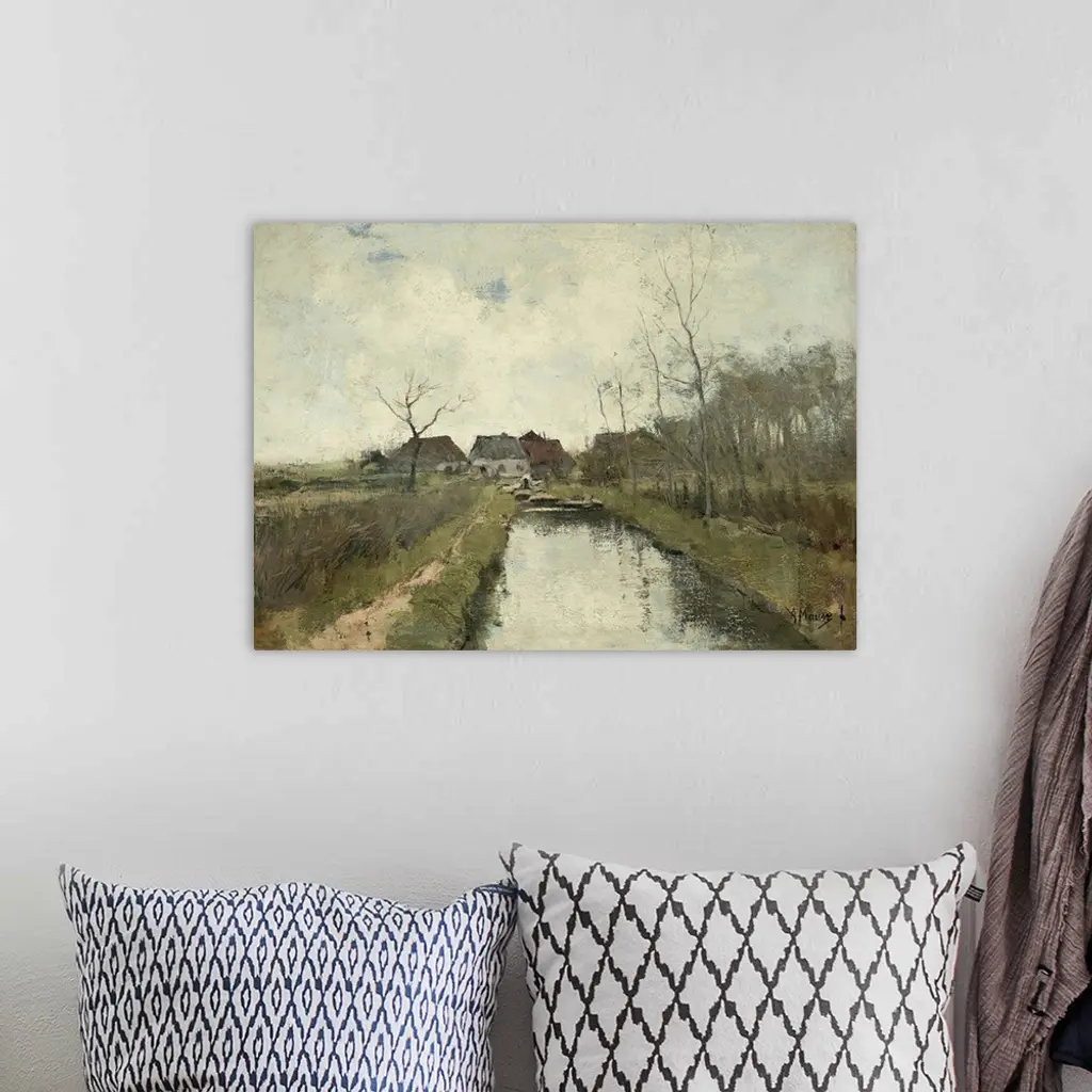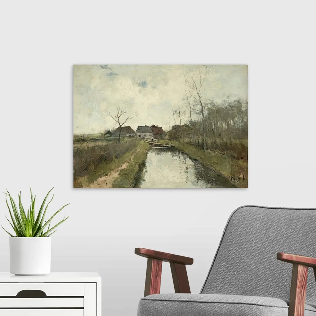 Cottages near a Ditch, by Anton Mauve, 1870-88, Dutch painting, oil on canvas. Polder landscape in the low-lying land reclaimed from the sea in the Netherlands.