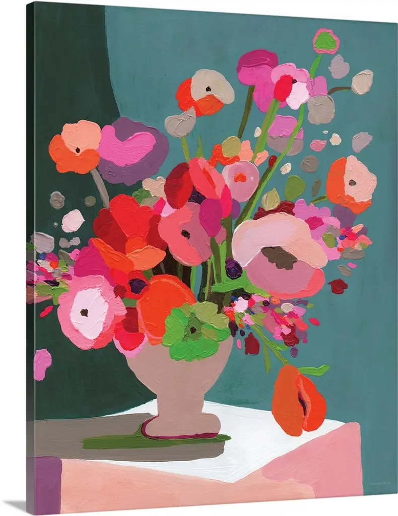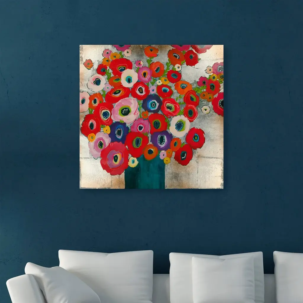 Bright pops of red petals make up this floral painting that will stand out in any space. Hang this on your wall for a fun pop of color. Our Gallery Wrap Canvas Prints are proudly assembled with high quality materials in California, USA. Each piece is printed on a thick, archival grade canvas using Giclee technology. It is then hand-stretched by our experienced artisans over solid pine bars, which will not warp over time. The final product is a piece personally crafted for you to confidently display on your wall. Care and Assembly: Ensure that the location of your piece has little to no exposure to heat, sunlight, and moisture. Wipe clean, only if needed. Each piece includes a sawtooth hanger to hang on your wall horizontally.