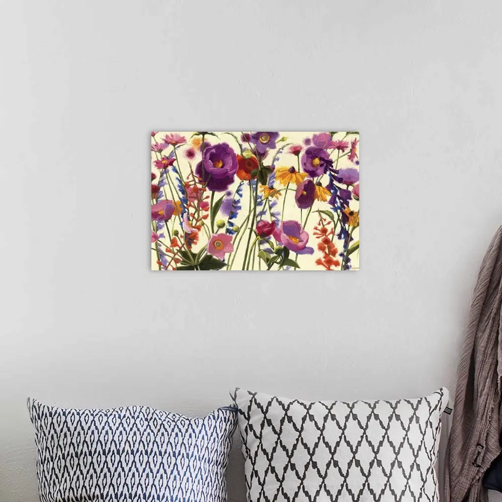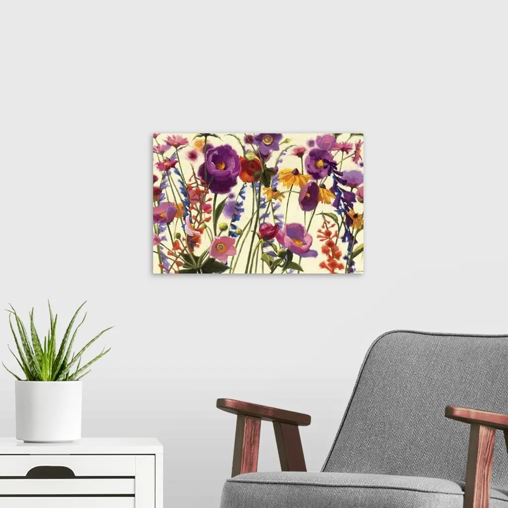 Contemporary painting of several types of flowers springing up from the bottom of the print.
