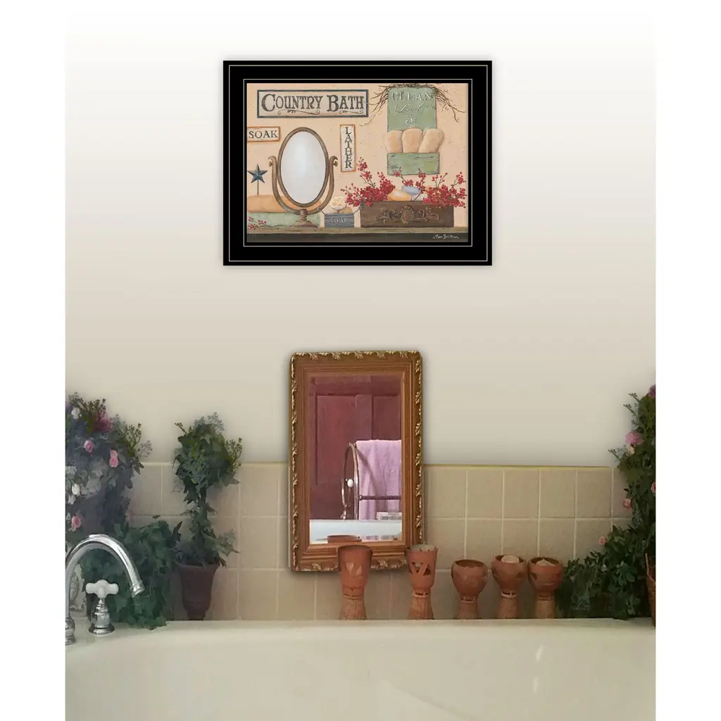 This country bath 12 black framed print wall art will add a beautiful decorative accent to your decor. This print is a visual artistic expression that allows you to decorate your space in style. Reproduced for you on paper, this hanging decorative accent will be a trendy and fashionable way to dress your walls. Hang on your wall to add some up to date fashion and decoration. Utilize this opportunity to create a focal point in the room with this fabulous wall decor option. 15" H x 19" W x 1" D