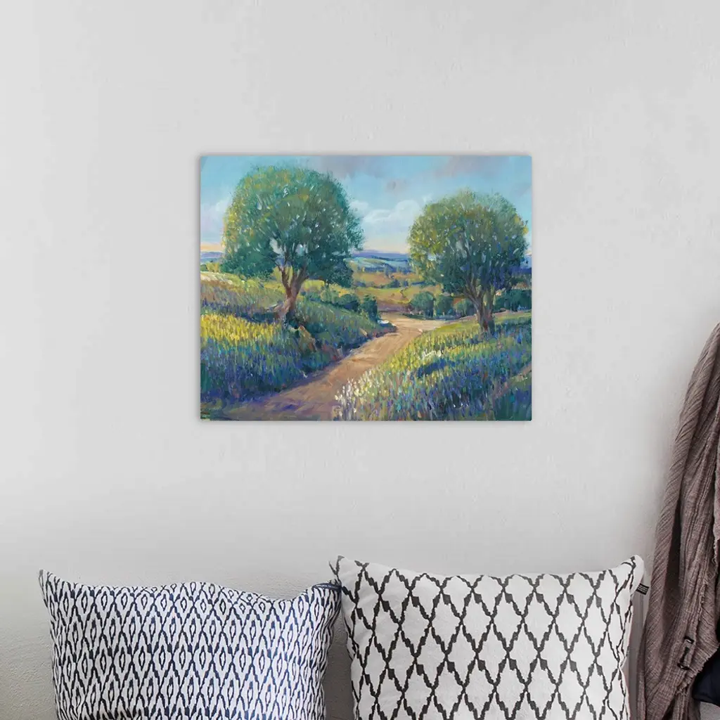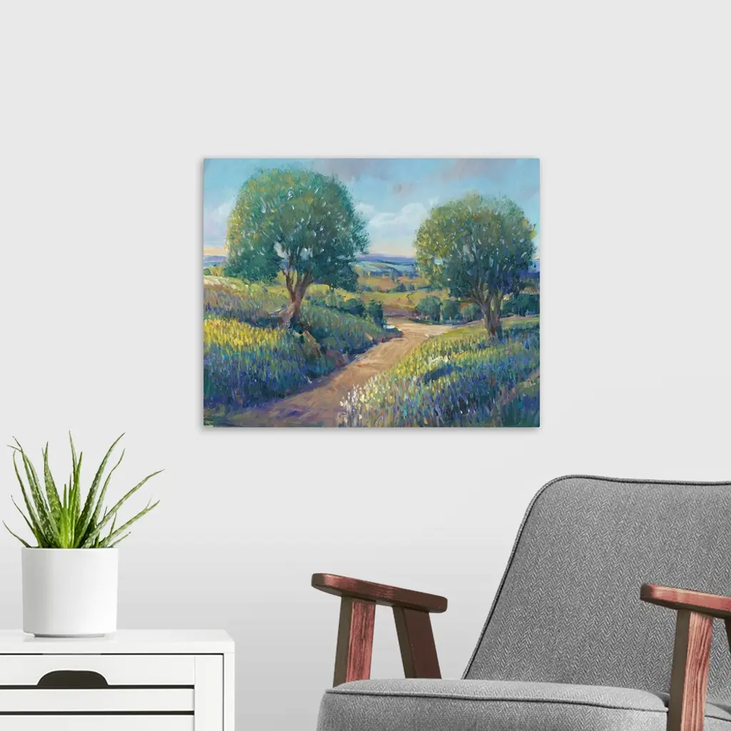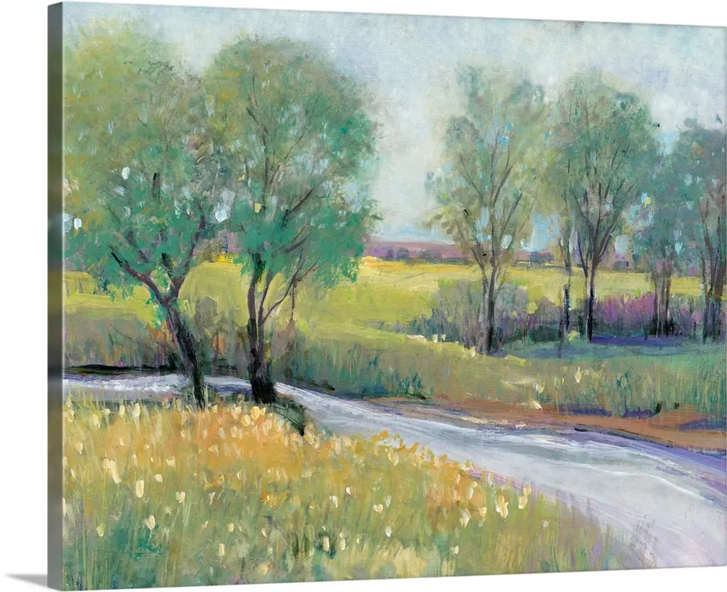 Contemporary landscape painting of trees along a dirt path in the countryside.