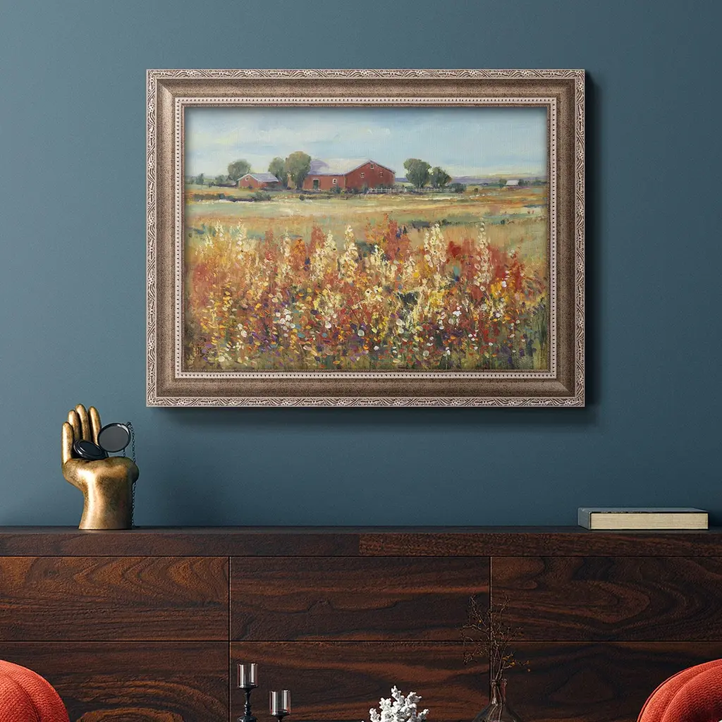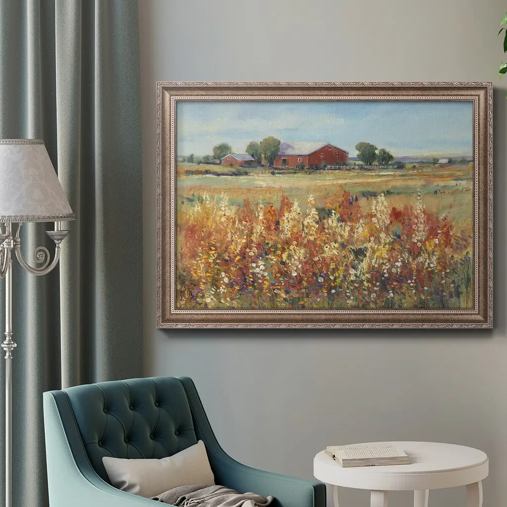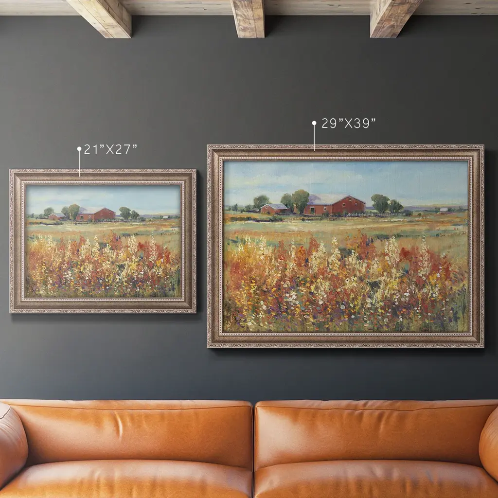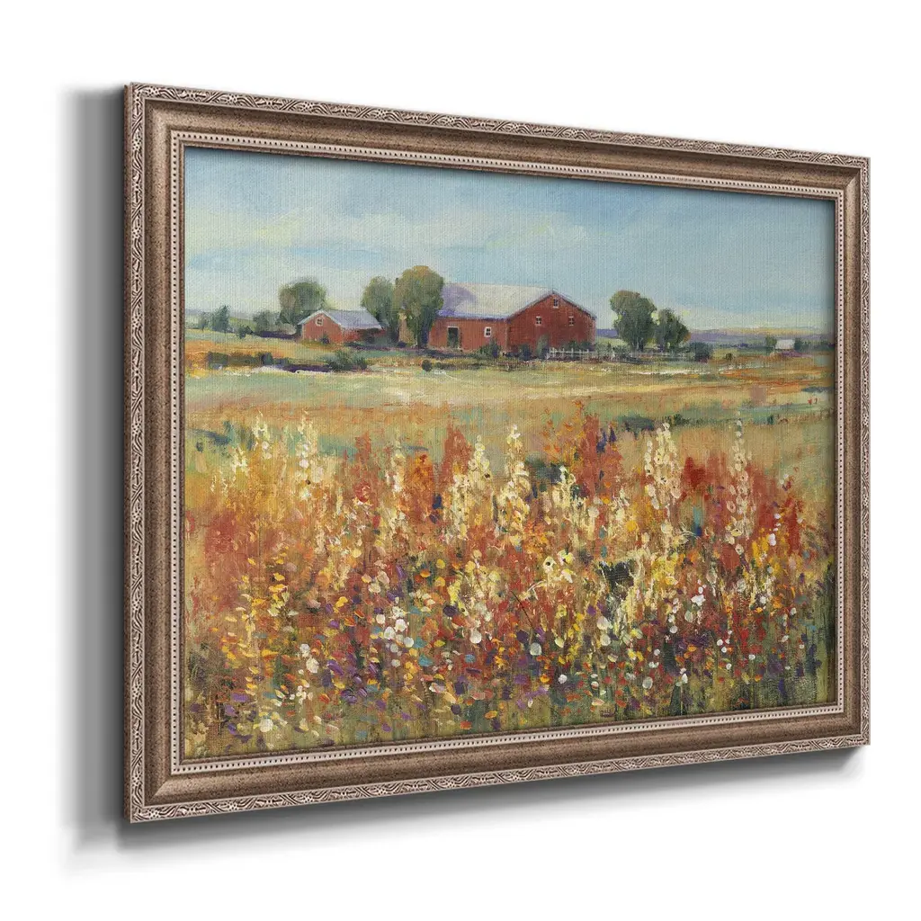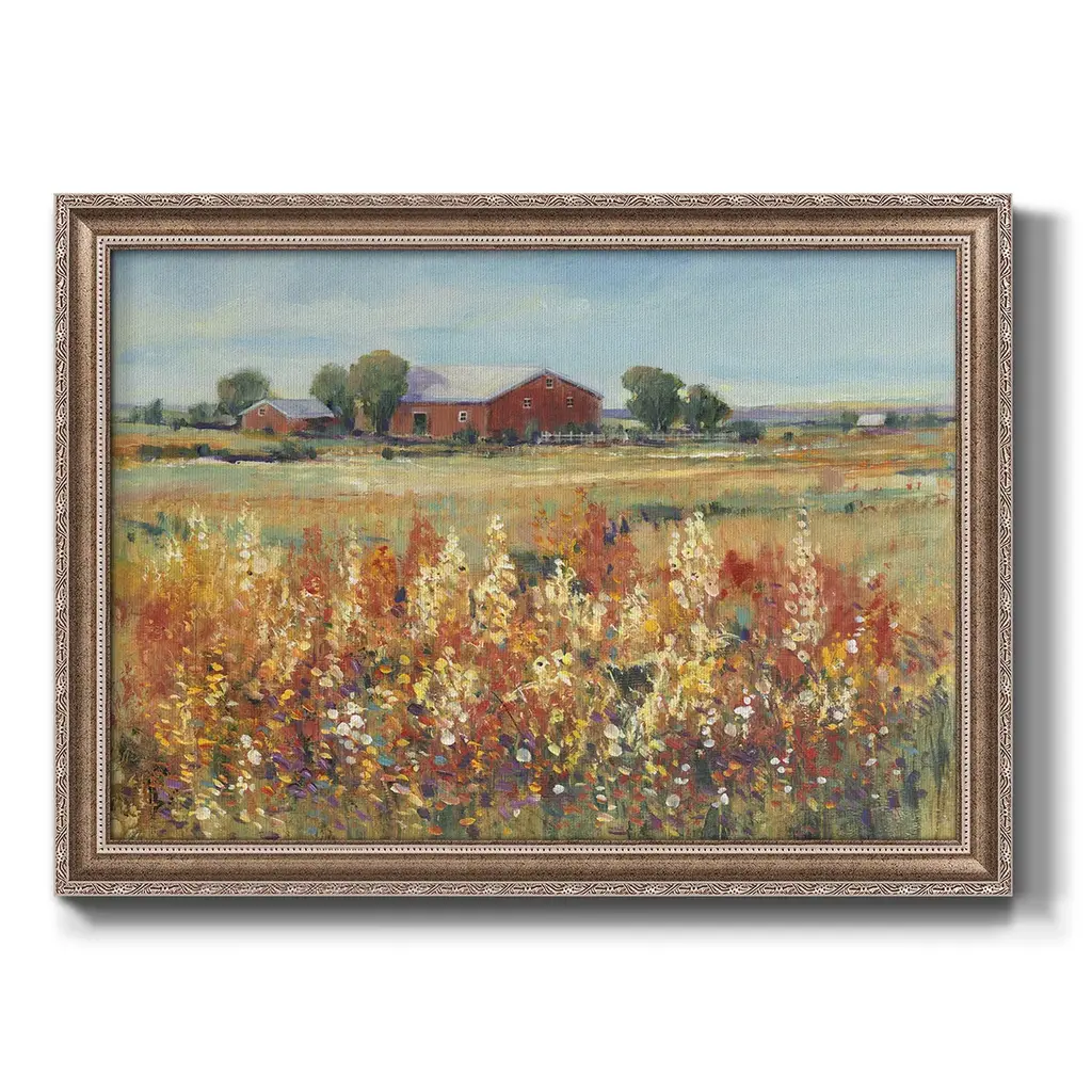 Country View II Premium Framed Canvas- Ready to Hang A Premium Framed Canvas created to last. Framed in distressed wood and available in an array of sizes and colors Featuring a beveled a solid wood stretcher bar, each piece comes ready to hand 3 SIZES AVAILABLE 16''X20'' - Overall Size 18'X27'' - Overall Size 24''x36'' - Overall Size Each piece is made to order. Each piece comes with hanging hardware. Made in the USA Ready to Hang Giclee Paper Print Acrylic Glass Beveled Matt Board