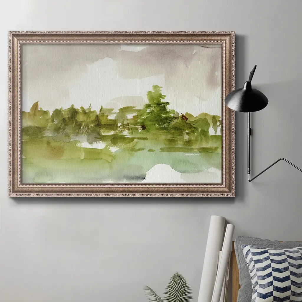 This colorful landscape is printed on deckled matte paper, floated over a white mat, and displayed in a gold-leaf-finished pine frame. Arrives ready to hang.