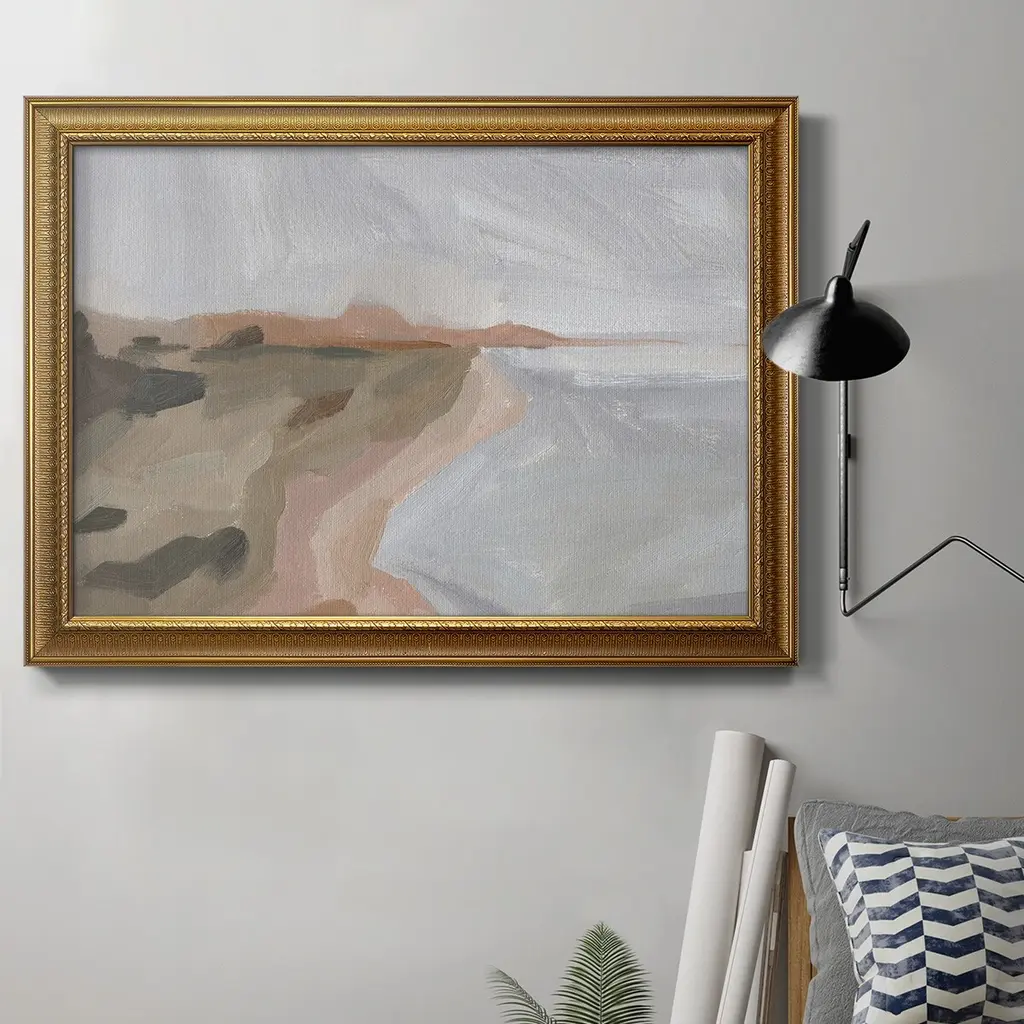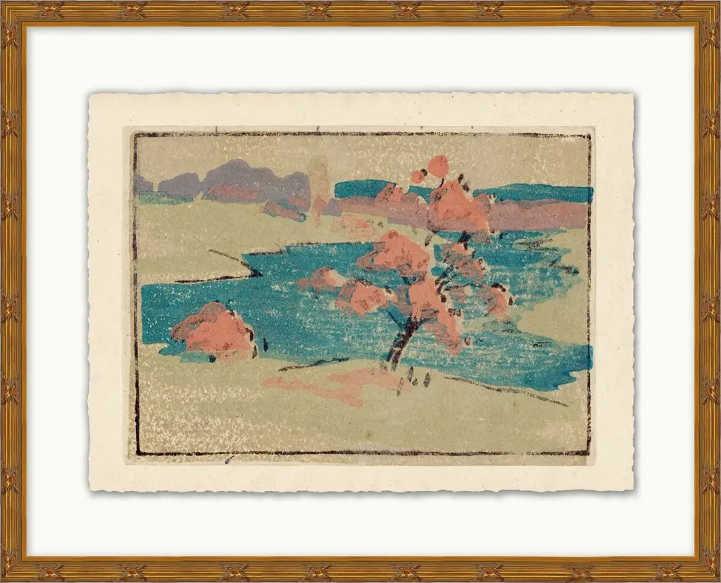 This colorful landscape is printed on deckled matte paper, floated over a white mat, and displayed in a gold-leaf-finished pine frame. Arrives ready to hang.
