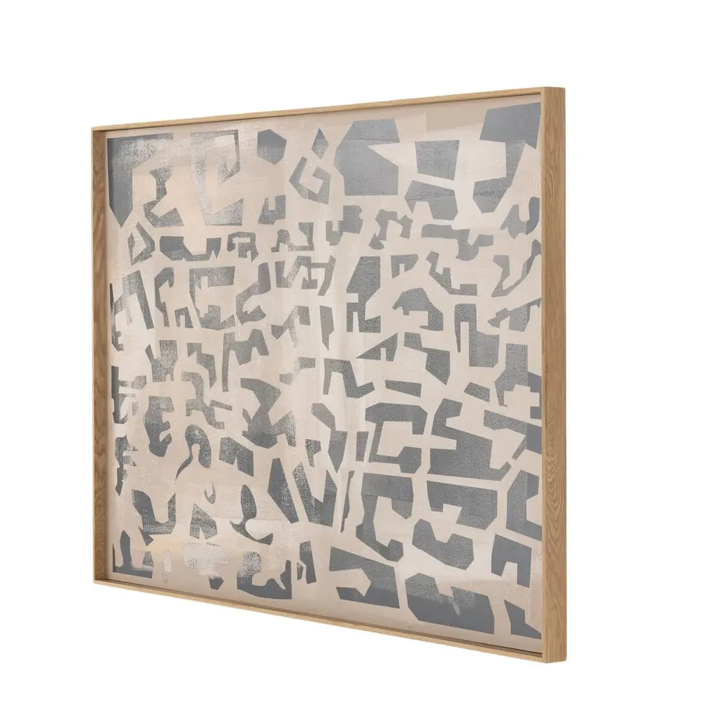 A Bangkok-based art house devoted to pioneering a unique brand of digital artisanship. Their works are created using an applied fusion of hand and machine, merging traditional handcrafted works like origami and stencil cutting with modern rendering technologies such as computer modeling, milling and cutting. Primitive shapes float throughout this piece. Framed for a gallery-quality look. Handmade in Austin, Texas.