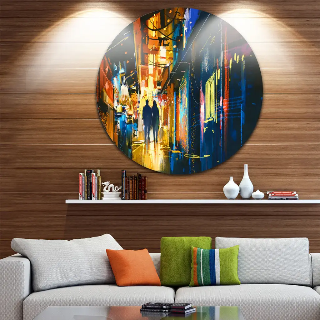 Couple Walking In An Alley, Cityscape Disc Metal Artwork, 23"