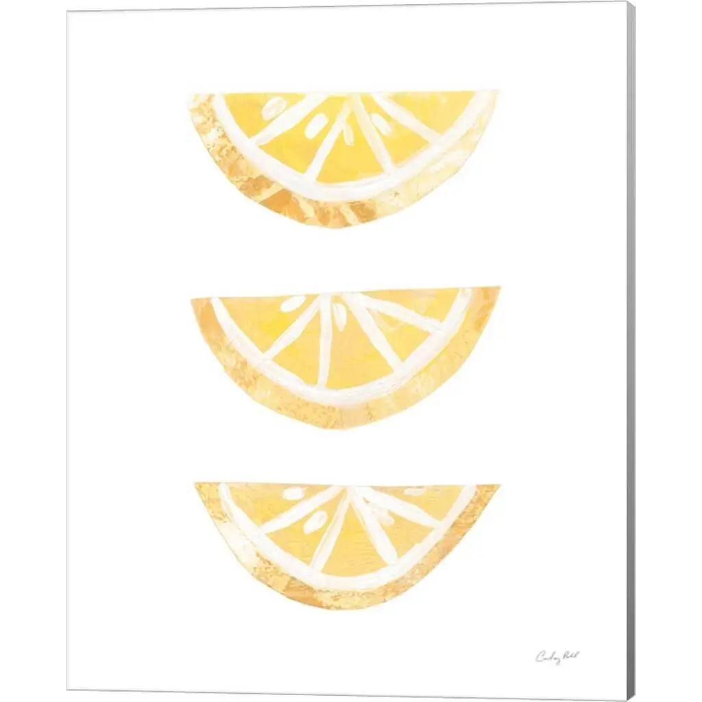 Lemon Slices I by Courtney Prahl is a high quality piece of canvas artwork. The finished size of this piece is 16" X 20", and it has a depth 0.75". There is a UV protective coating over the entire image, and it is ready to hang on your wall with a standard drywall screw (not included). 100% Satisfaction Guaranteed.