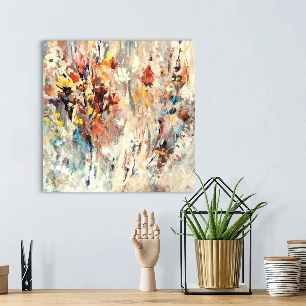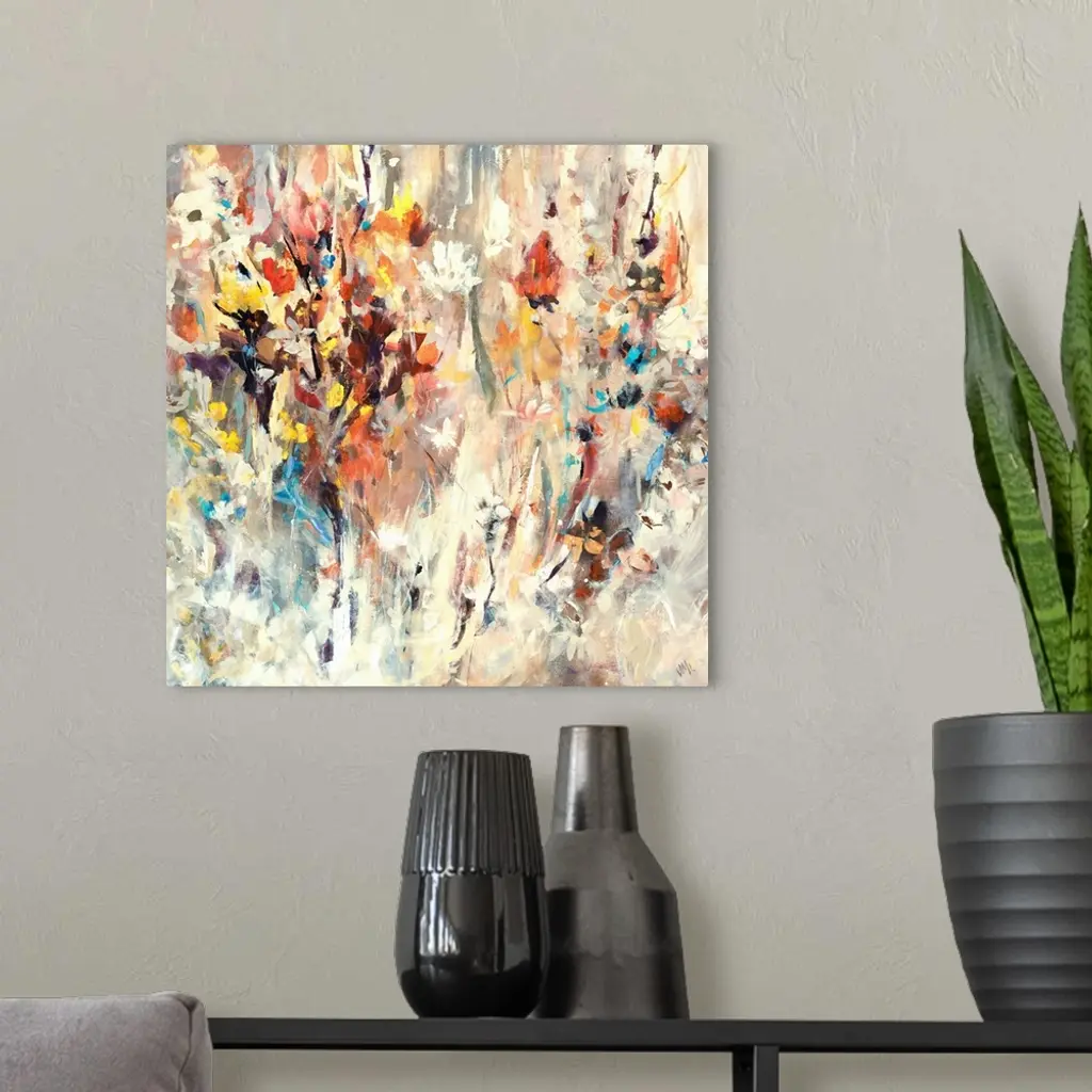 Contemporary painting of many bright flowers, seemingly jumping from the beige background, full of motion and splashes of color.
