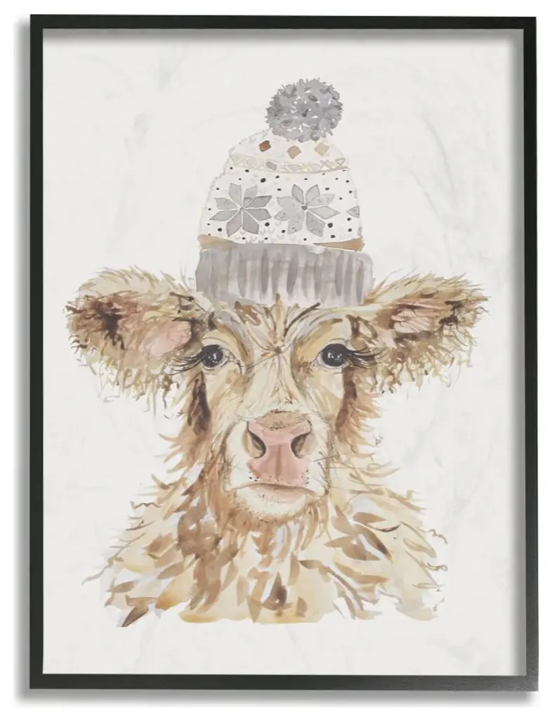 Cow With Beanie Hat Winter Farm Watercolor Painting, 16"x20"