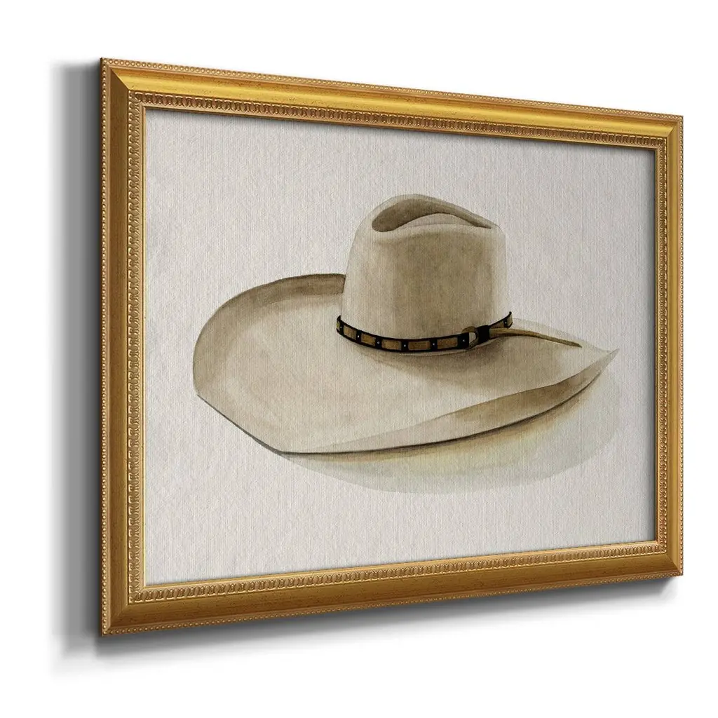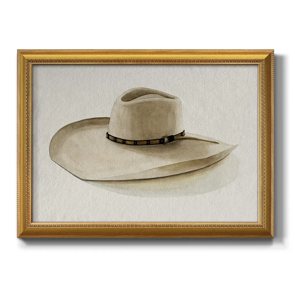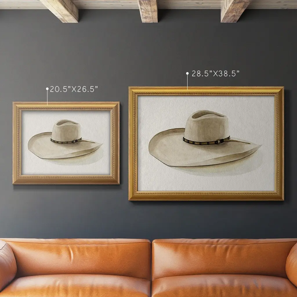Cowboy Hat I Premium Framed Canvas- Ready to Hang A Premium Framed Canvas created to last. Framed in distressed wood and available in an array of sizes and colors Featuring a beveled a solid wood stretcher bar, each piece comes ready to hand 3 SIZES AVAILABLE 16''X20'' - Overall Size 18'X27'' - Overall Size 24''x36'' - Overall Size Each piece is made to order. Each piece comes with hanging hardware. Made in the USA Ready to Hang Giclee Paper Print Acrylic Glass Beveled Matt Board