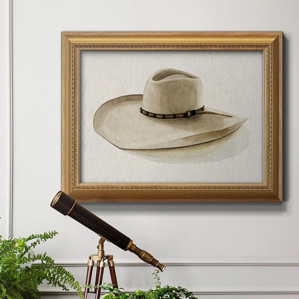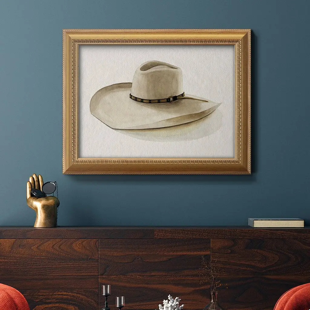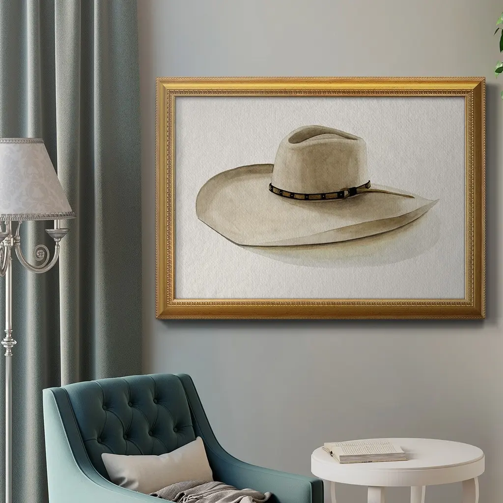 Cowboy Hat I Premium Framed Canvas- Ready to Hang A Premium Framed Canvas created to last. Framed in distressed wood and available in an array of sizes and colors Featuring a beveled a solid wood stretcher bar, each piece comes ready to hand 3 SIZES AVAILABLE 16''X20'' - Overall Size 18'X27'' - Overall Size 24''x36'' - Overall Size Each piece is made to order. Each piece comes with hanging hardware. Made in the USA Ready to Hang Giclee Paper Print Acrylic Glass Beveled Matt Board