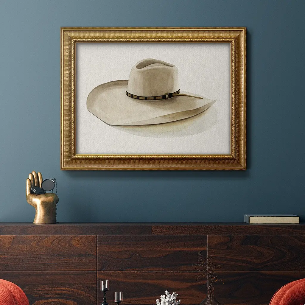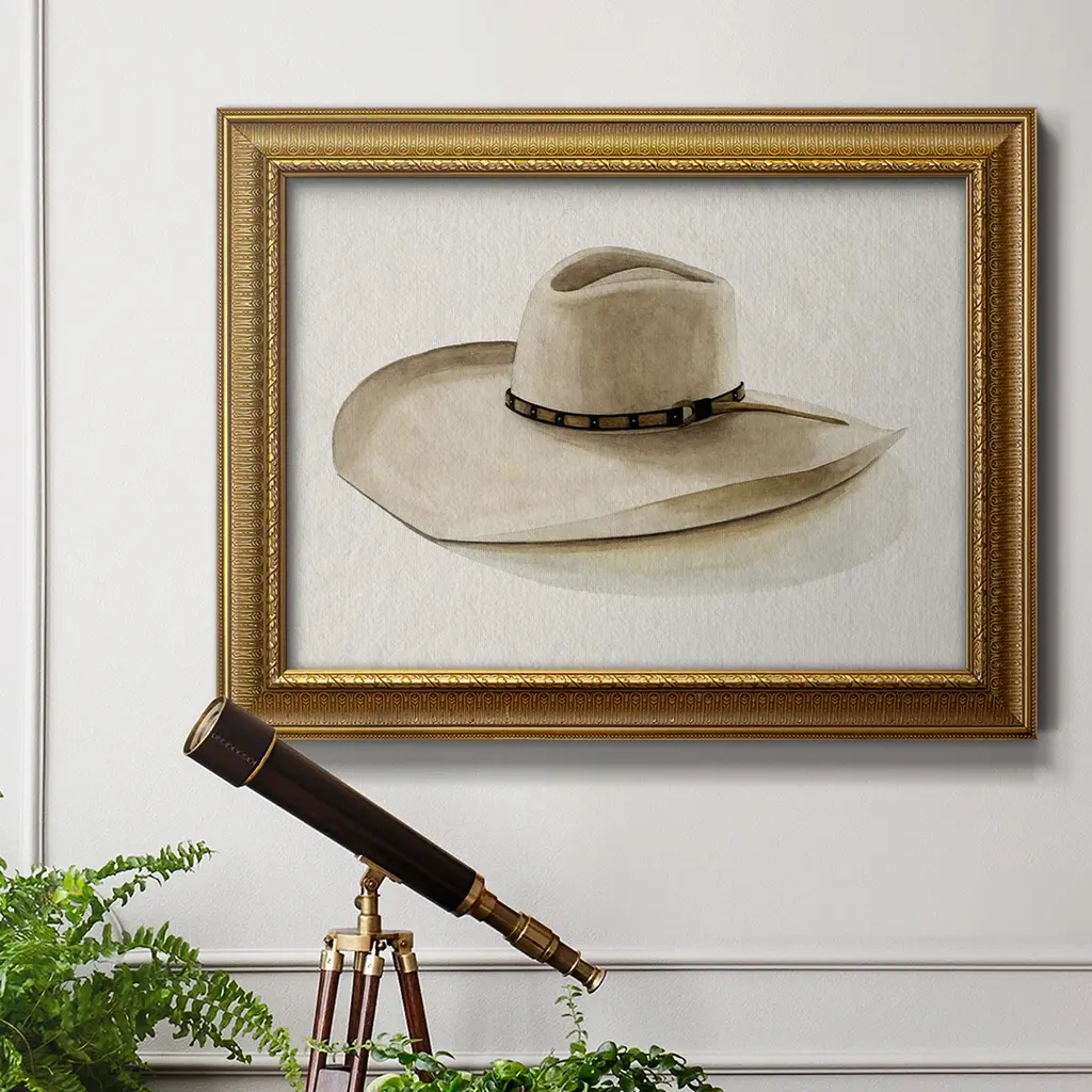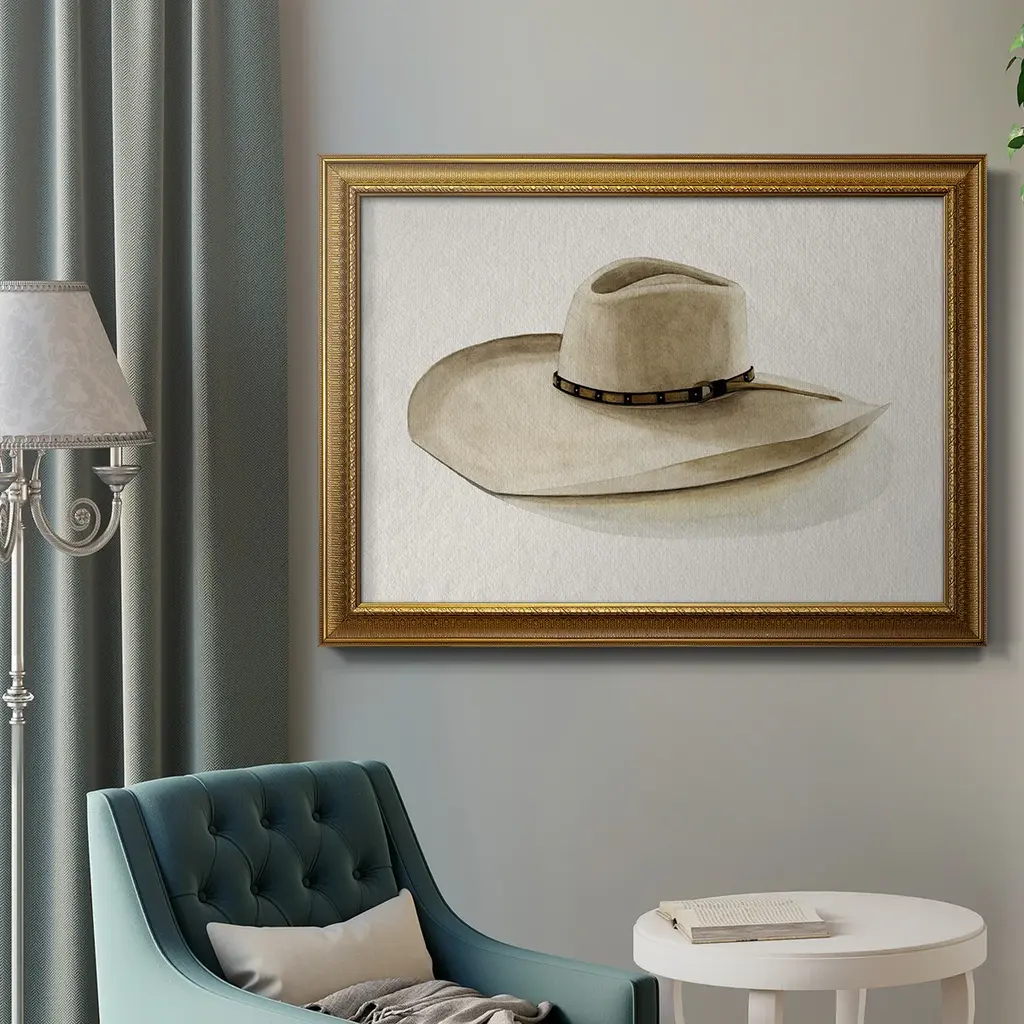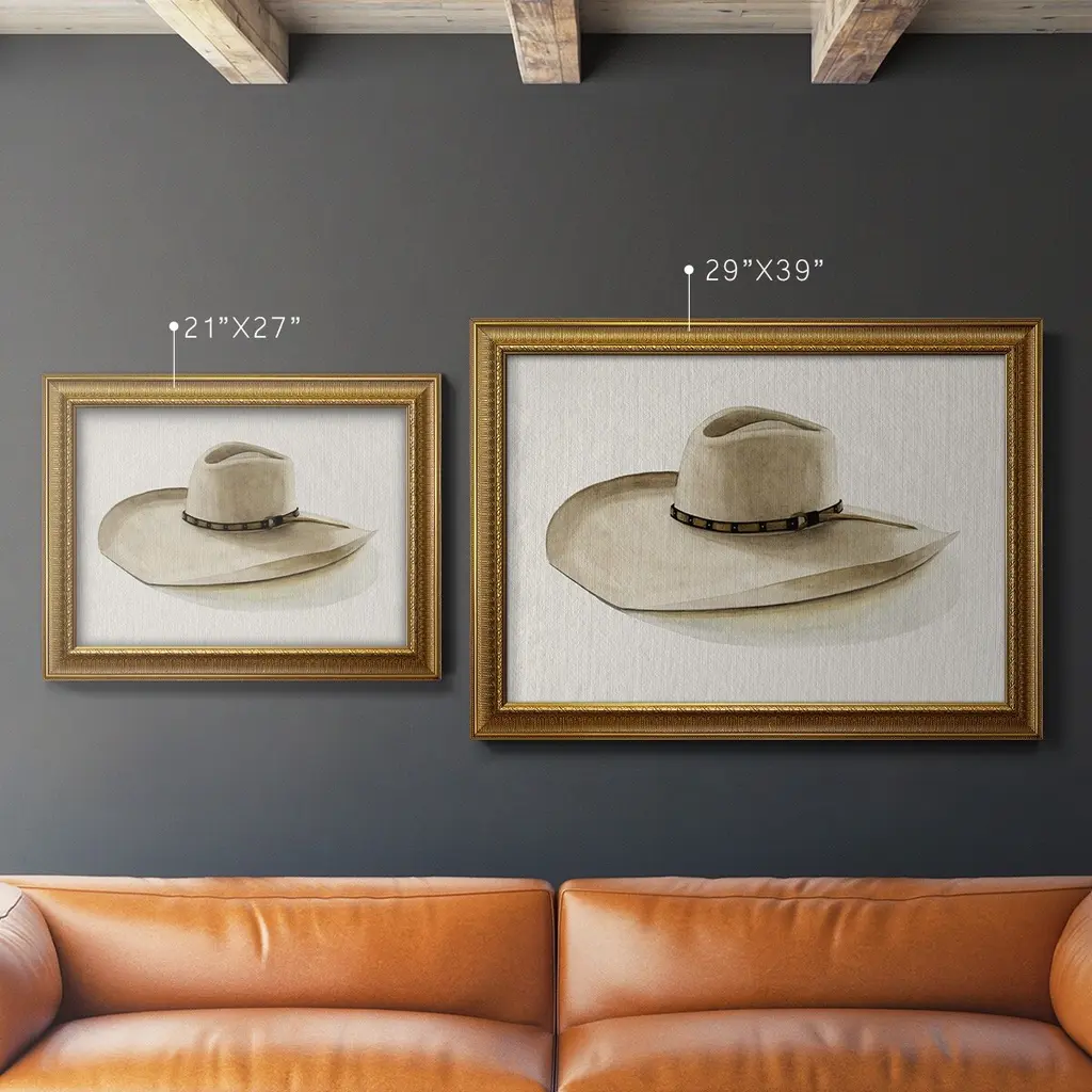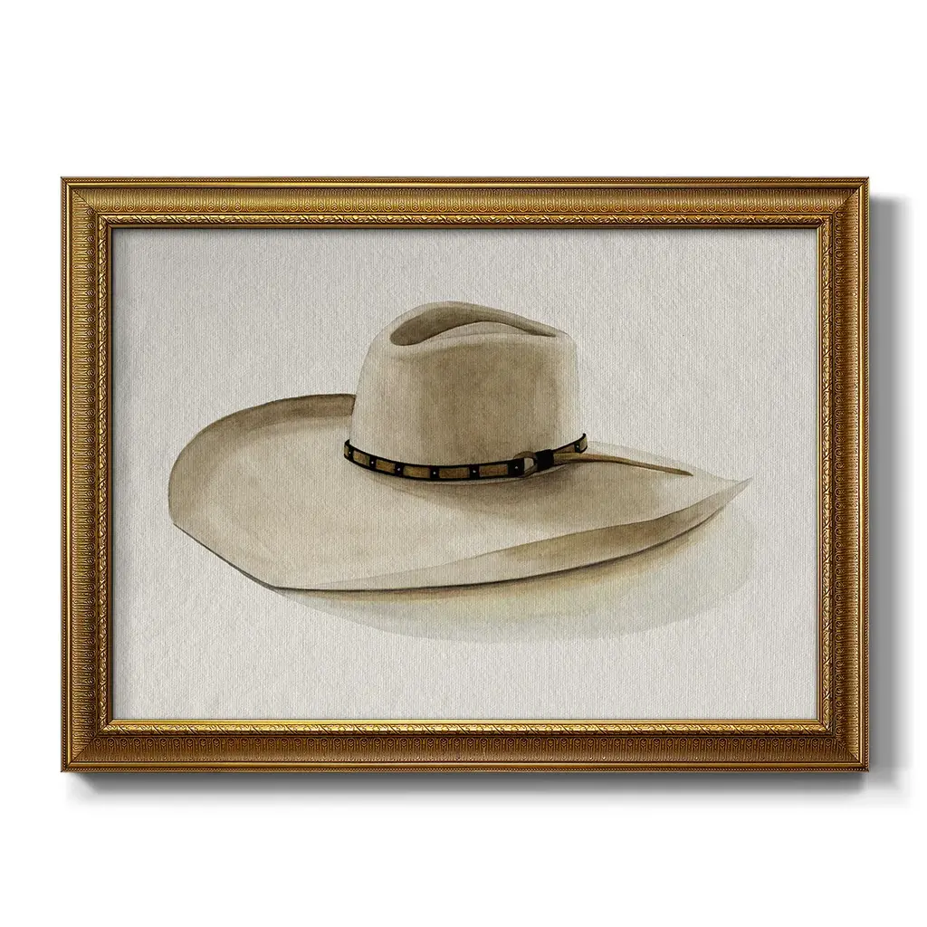 Cowboy Hat I Premium Framed Canvas- Ready to Hang A Premium Framed Canvas created to last. Framed in distressed wood and available in an array of sizes and colors Featuring a beveled a solid wood stretcher bar, each piece comes ready to hand 3 SIZES AVAILABLE 16''X20'' - Overall Size 18'X27'' - Overall Size 24''x36'' - Overall Size Each piece is made to order. Each piece comes with hanging hardware. Made in the USA Ready to Hang Giclee Paper Print Acrylic Glass Beveled Matt Board