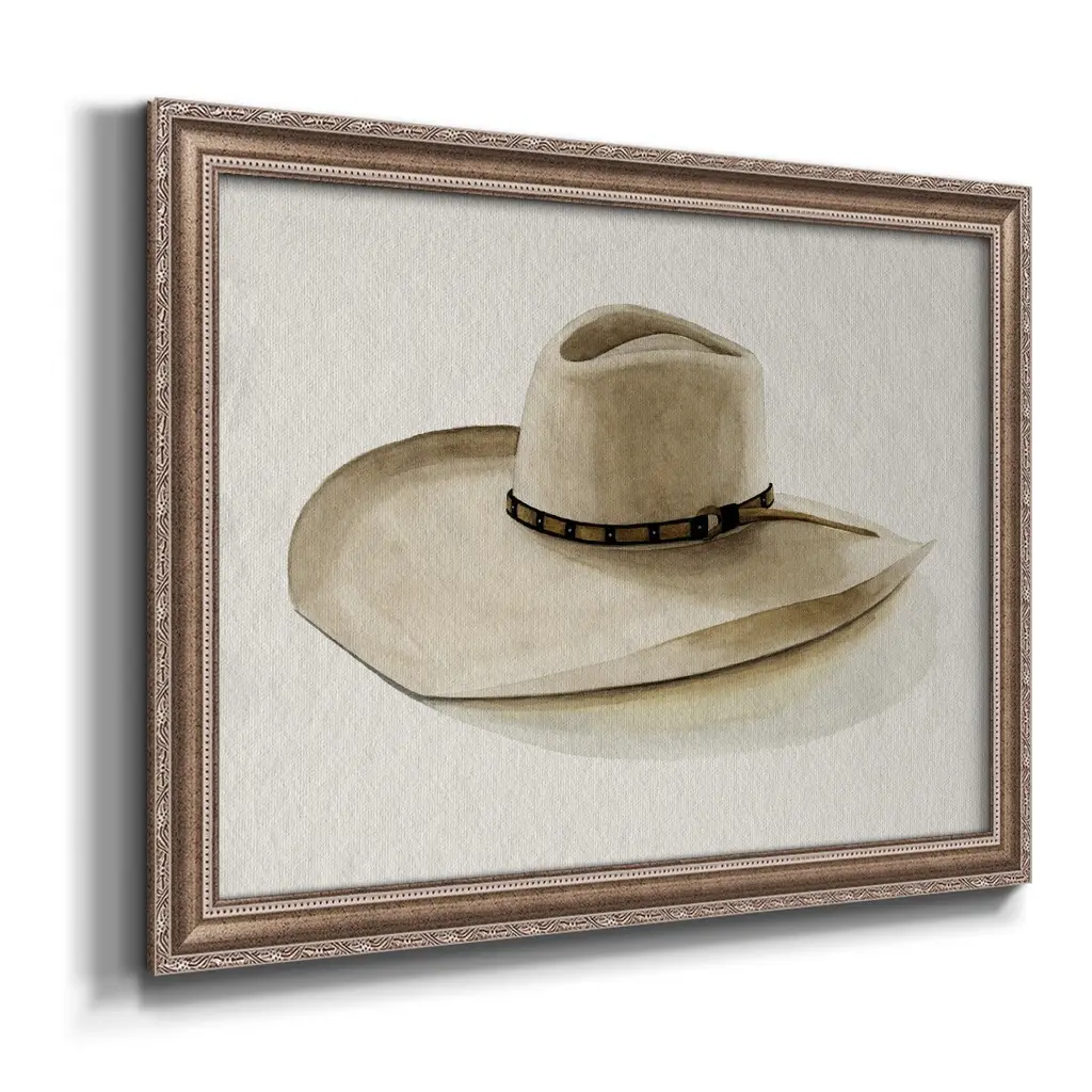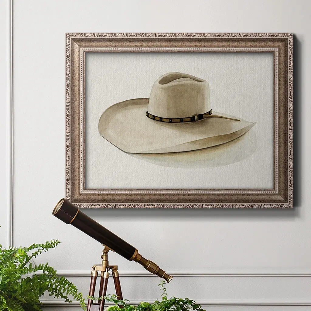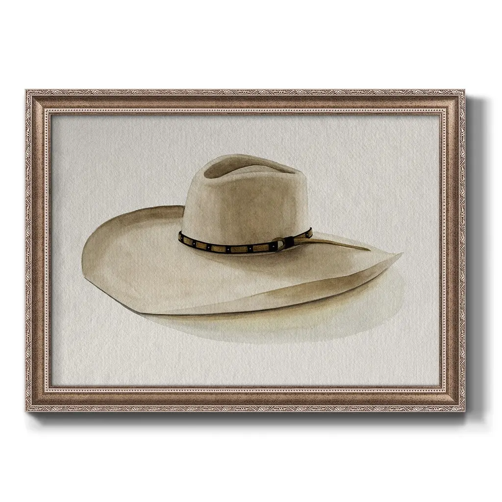 Cowboy Hat I Premium Framed Canvas- Ready to Hang A Premium Framed Canvas created to last. Framed in distressed wood and available in an array of sizes and colors Featuring a beveled a solid wood stretcher bar, each piece comes ready to hand 3 SIZES AVAILABLE 16''X20'' - Overall Size 18'X27'' - Overall Size 24''x36'' - Overall Size Each piece is made to order. Each piece comes with hanging hardware. Made in the USA Ready to Hang Giclee Paper Print Acrylic Glass Beveled Matt Board