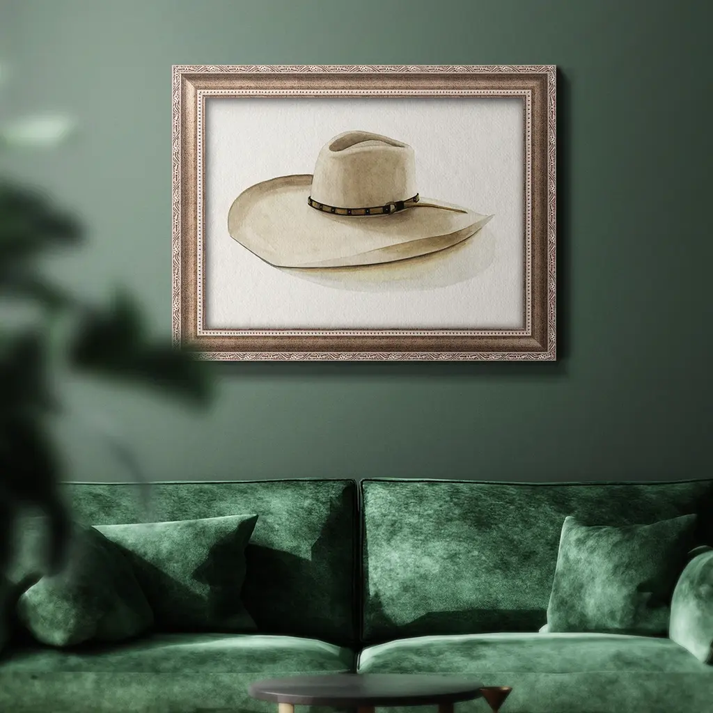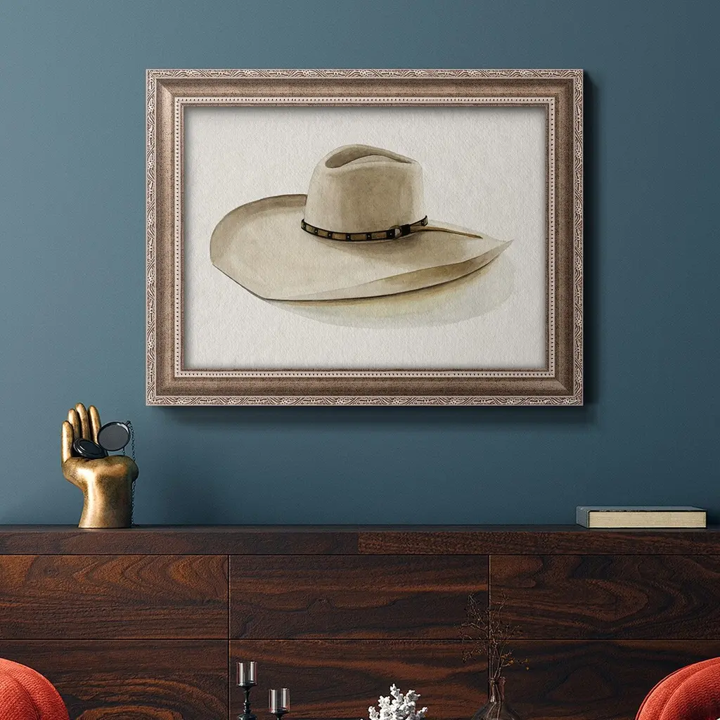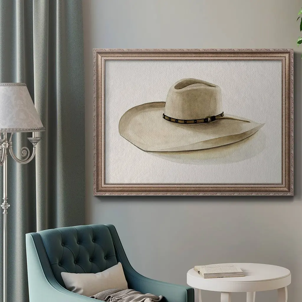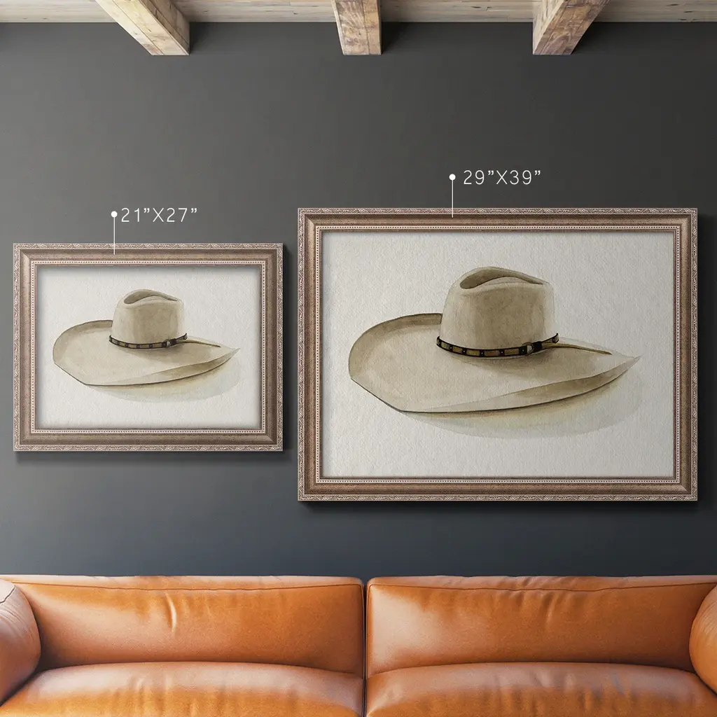 Cowboy Hat I Premium Framed Canvas- Ready to Hang A Premium Framed Canvas created to last. Framed in distressed wood and available in an array of sizes and colors Featuring a beveled a solid wood stretcher bar, each piece comes ready to hand 3 SIZES AVAILABLE 16''X20'' - Overall Size 18'X27'' - Overall Size 24''x36'' - Overall Size Each piece is made to order. Each piece comes with hanging hardware. Made in the USA Ready to Hang Giclee Paper Print Acrylic Glass Beveled Matt Board