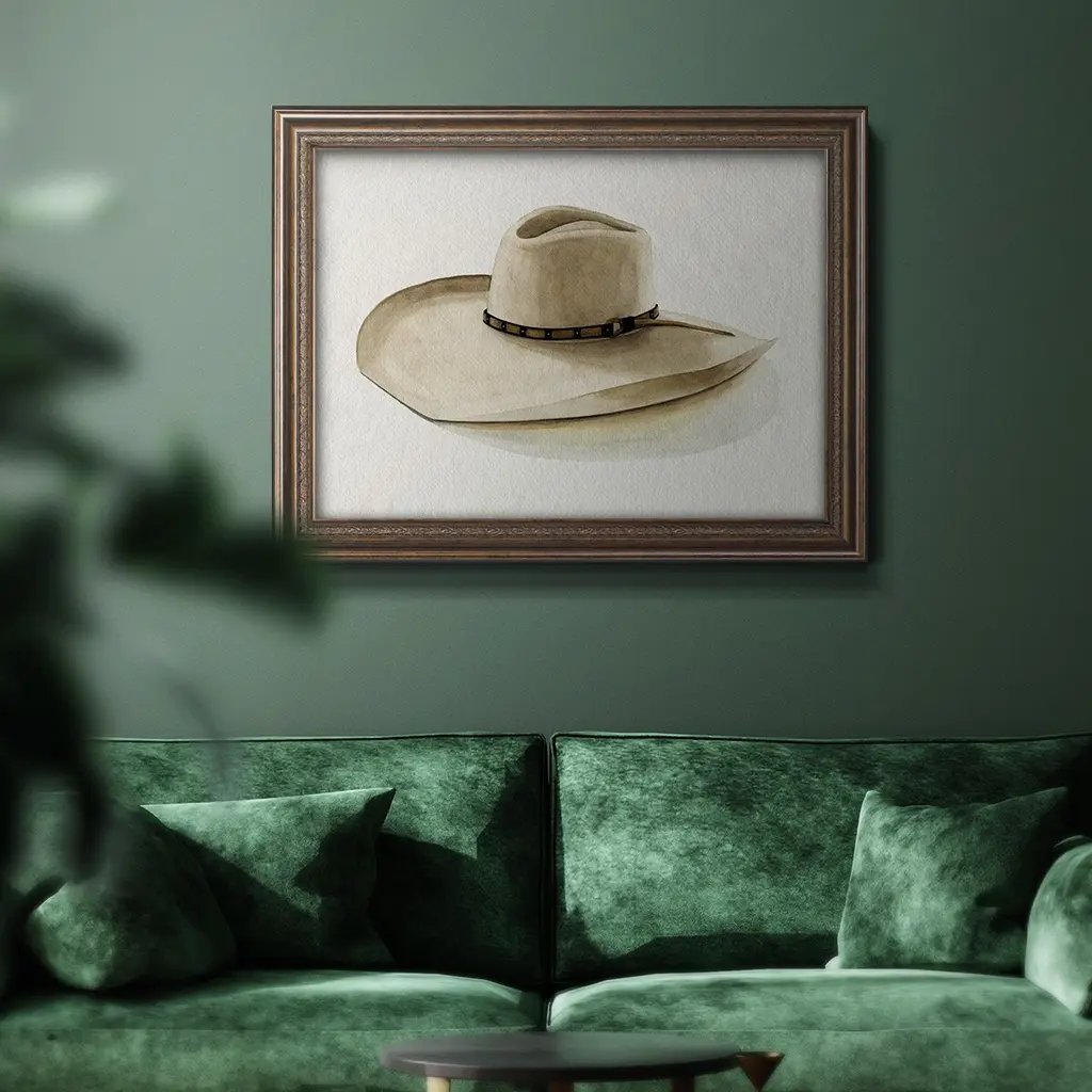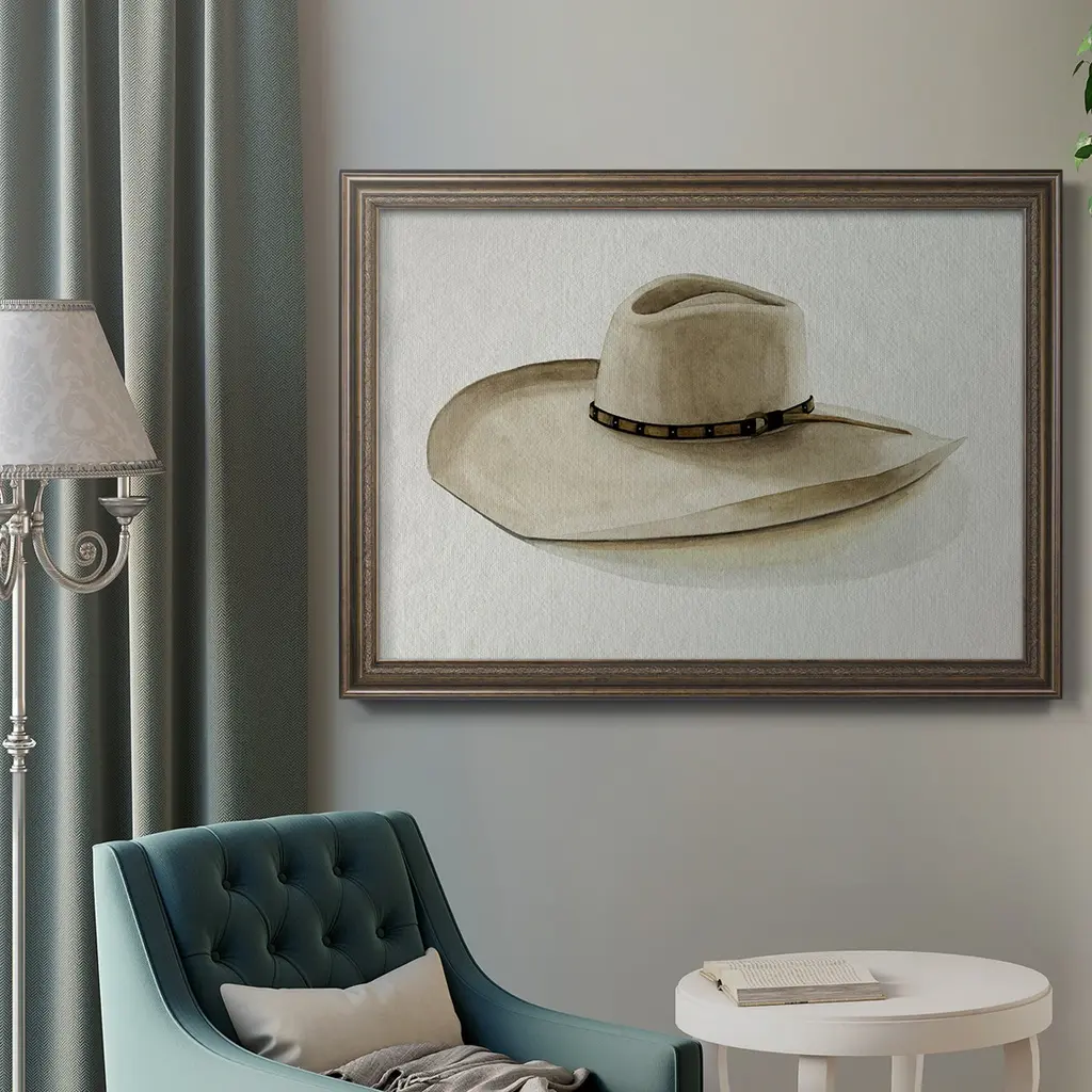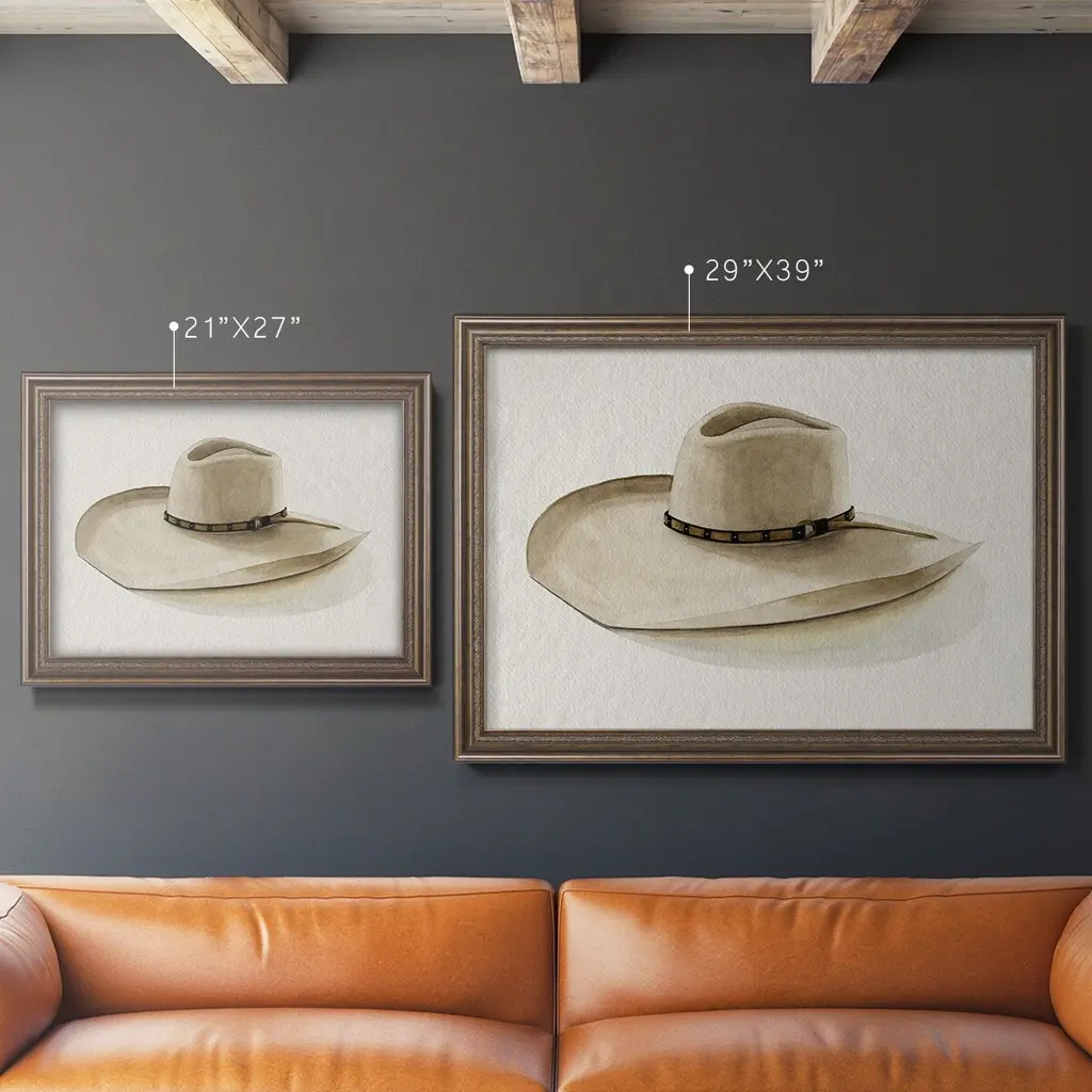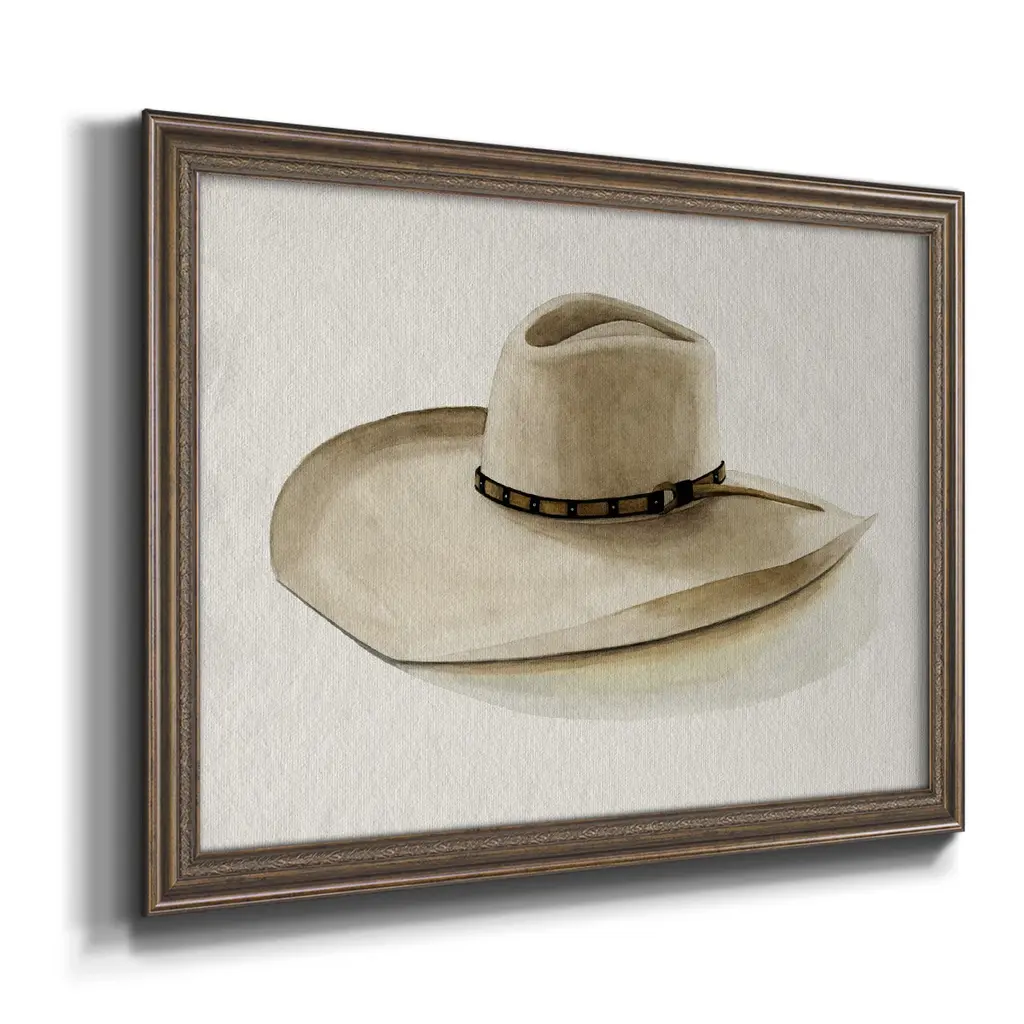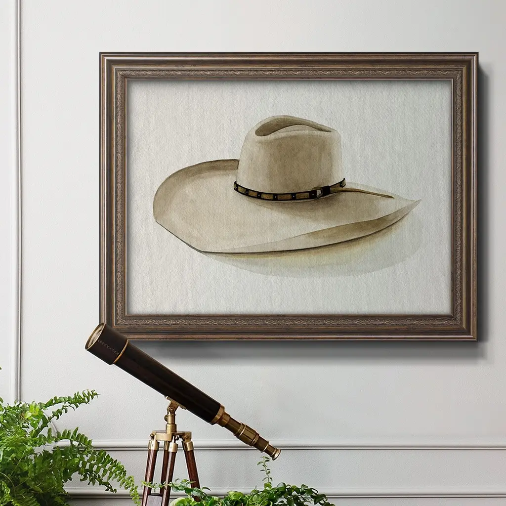 Cowboy Hat I Premium Framed Canvas- Ready to Hang A Premium Framed Canvas created to last. Framed in distressed wood and available in an array of sizes and colors Featuring a beveled a solid wood stretcher bar, each piece comes ready to hand 3 SIZES AVAILABLE 16''X20'' - Overall Size 18'X27'' - Overall Size 24''x36'' - Overall Size Each piece is made to order. Each piece comes with hanging hardware. Made in the USA Ready to Hang Giclee Paper Print Acrylic Glass Beveled Matt Board