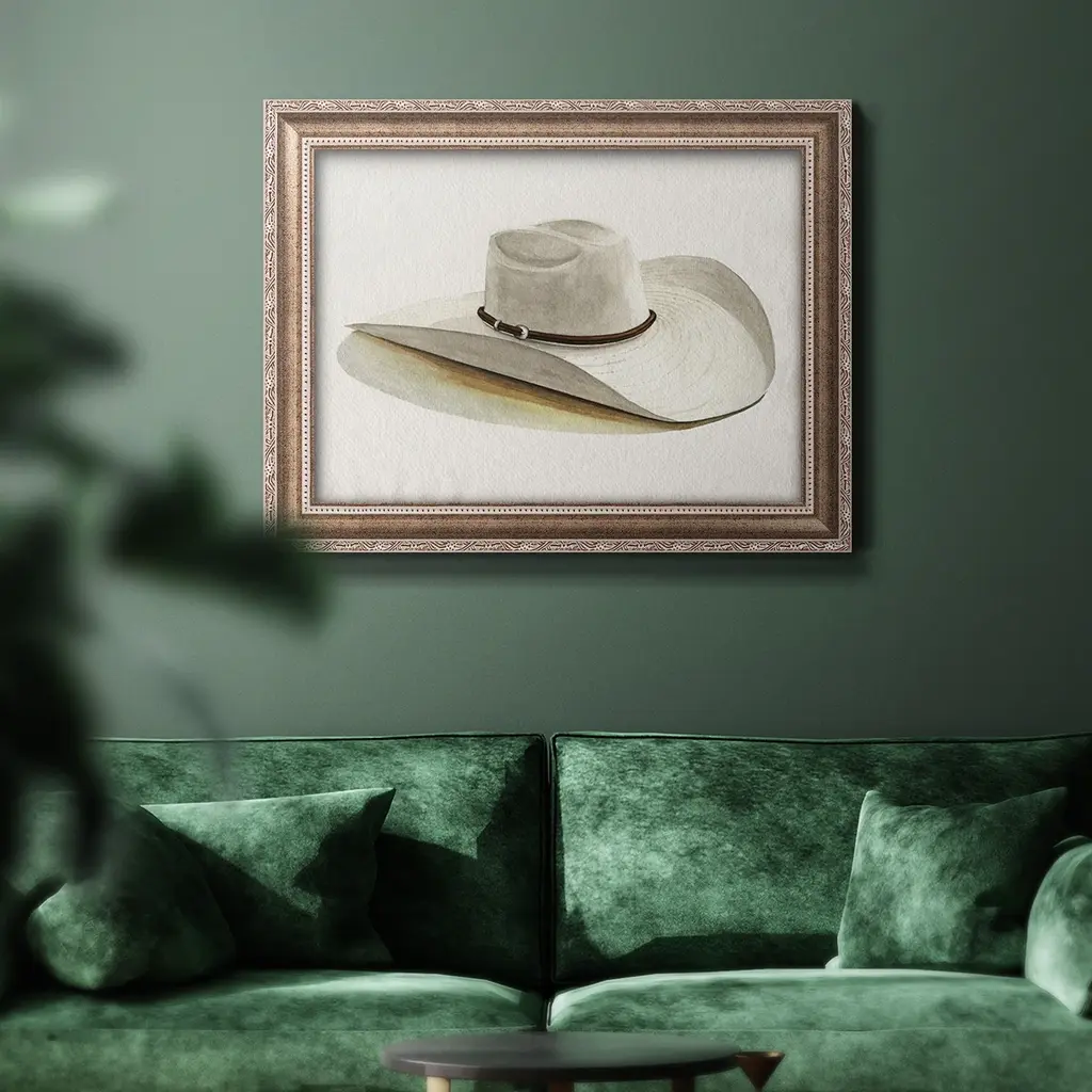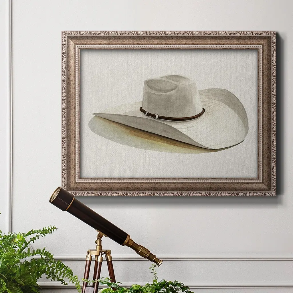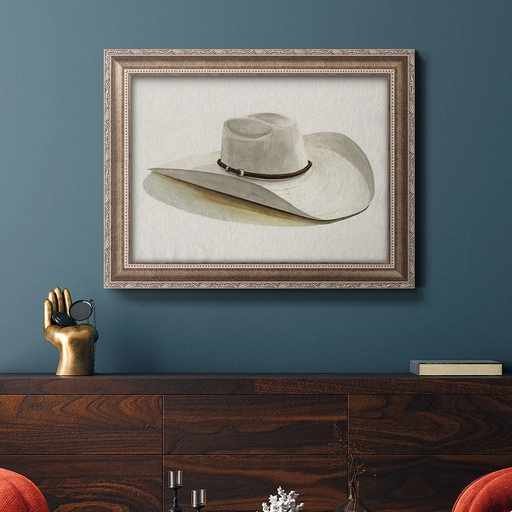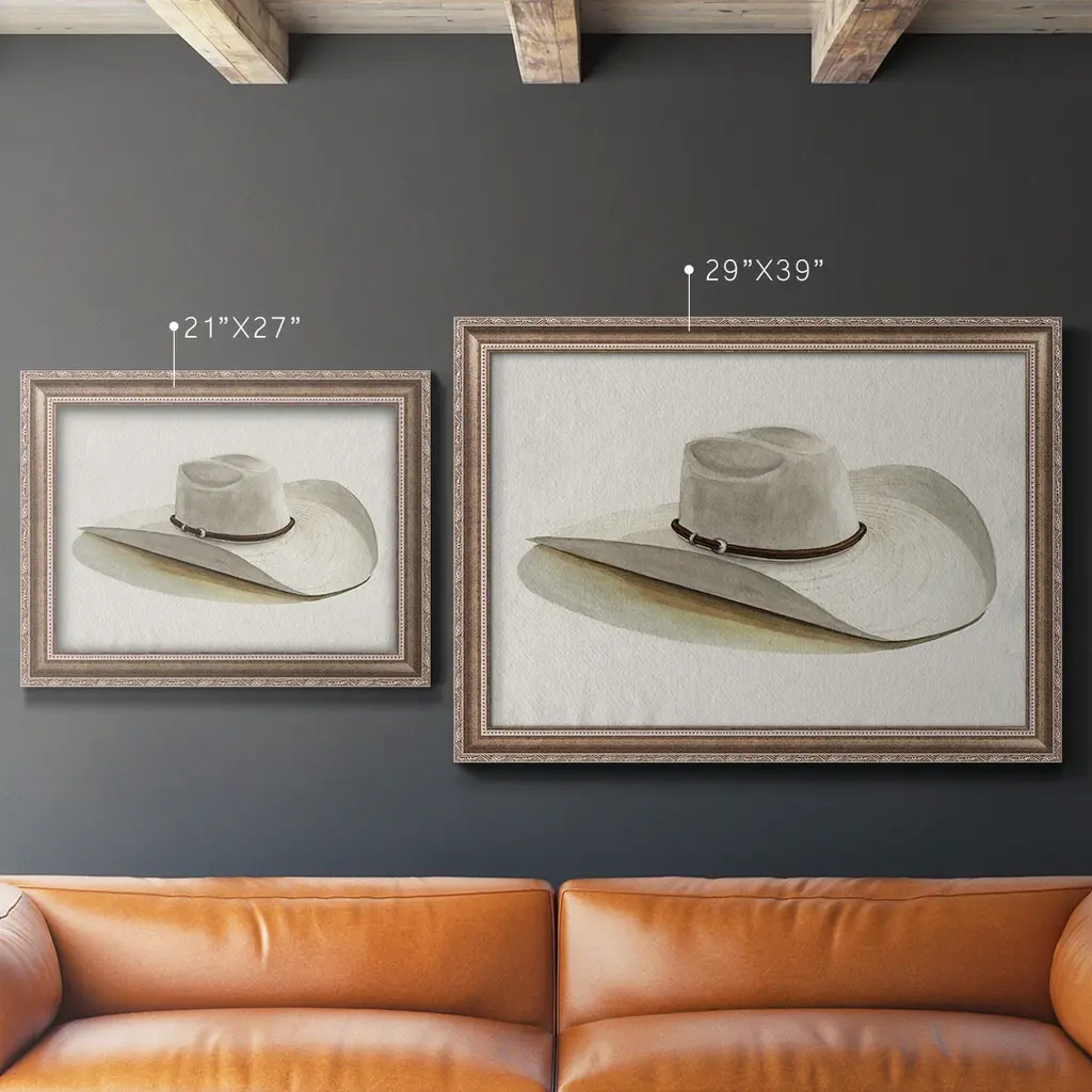 Cowboy Hat II Premium Framed Canvas- Ready to Hang A Premium Framed Canvas created to last. Framed in distressed wood and available in an array of sizes and colors Featuring a beveled a solid wood stretcher bar, each piece comes ready to hand 3 SIZES AVAILABLE 16''X20'' - Overall Size 18'X27'' - Overall Size 24''x36'' - Overall Size Each piece is made to order. Each piece comes with hanging hardware. Made in the USA Ready to Hang Giclee Paper Print Acrylic Glass Beveled Matt Board