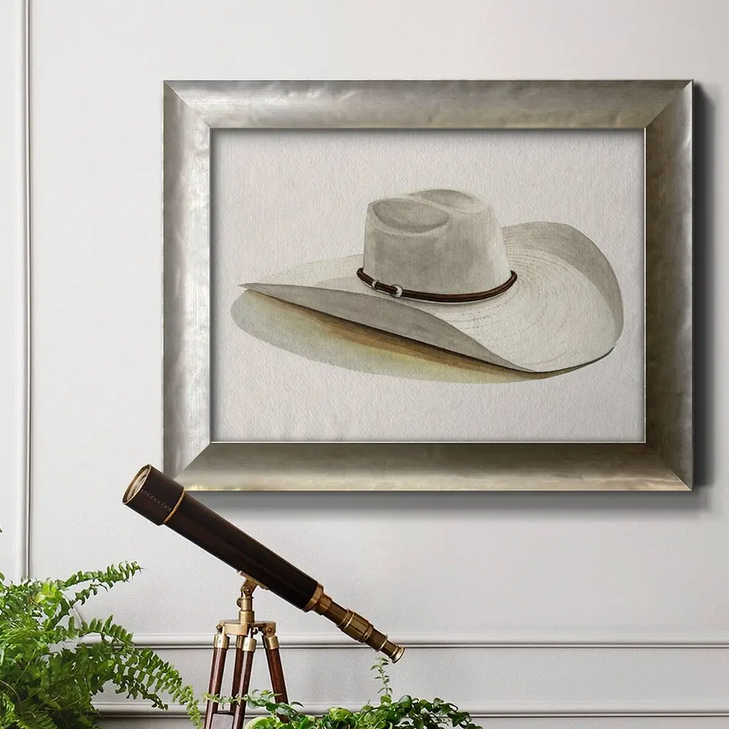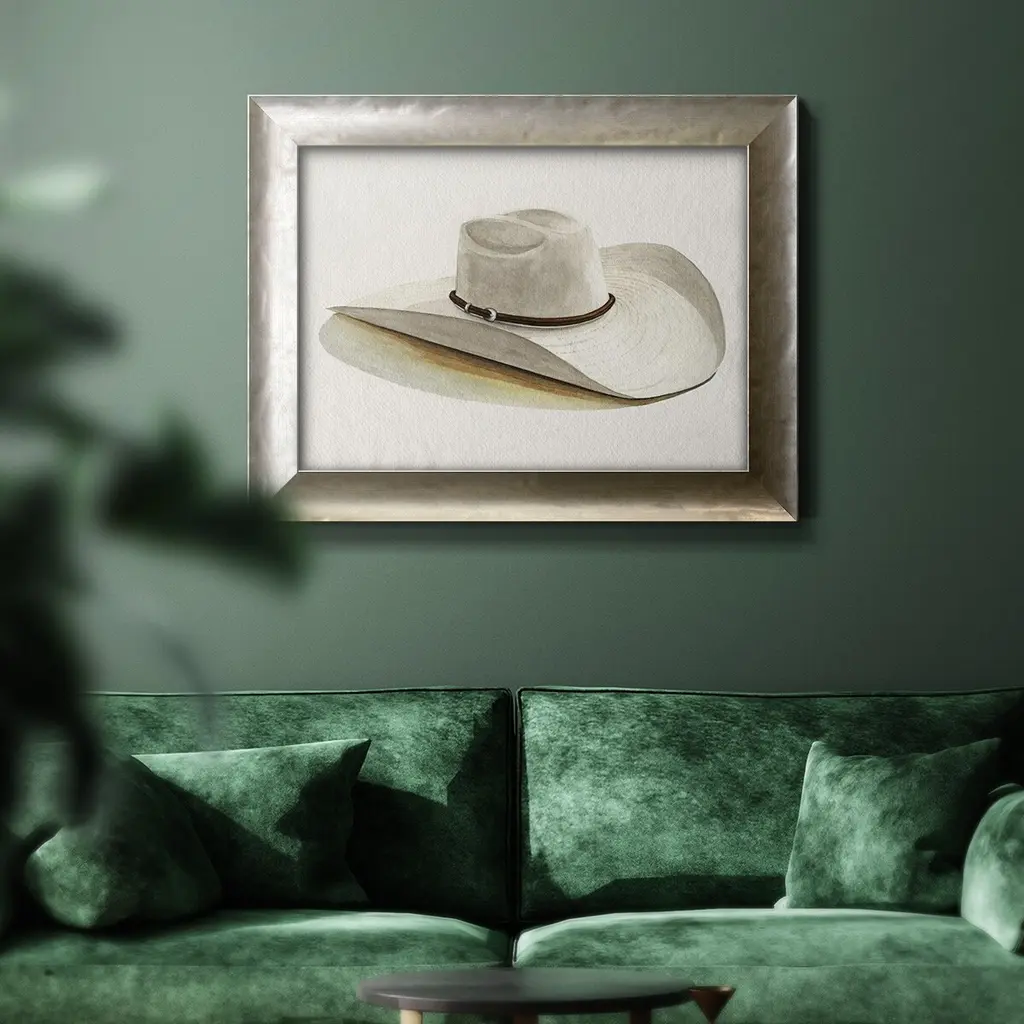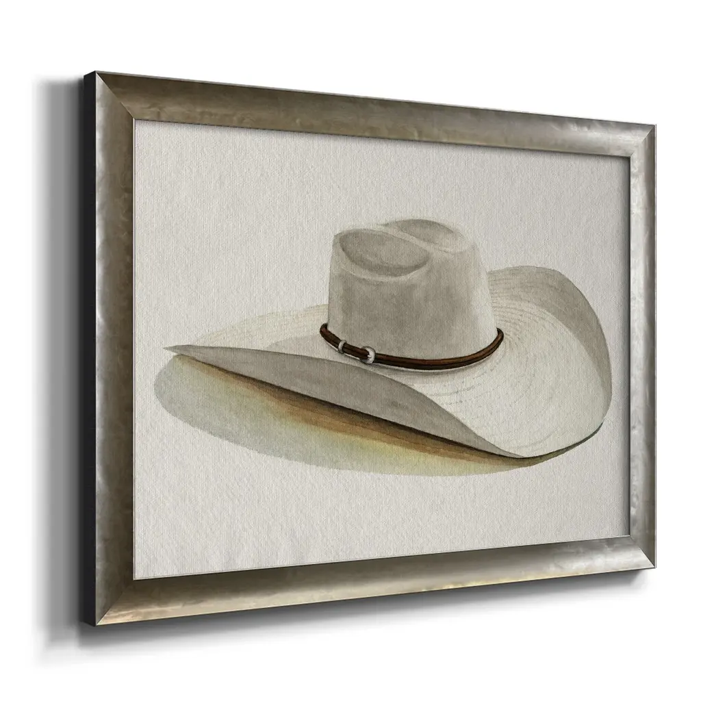 Cowboy Hat II Premium Framed Canvas- Ready to Hang A Premium Framed Canvas created to last. Framed in distressed wood and available in an array of sizes and colors Featuring a beveled a solid wood stretcher bar, each piece comes ready to hand 3 SIZES AVAILABLE 16''X20'' - Overall Size 18'X27'' - Overall Size 24''x36'' - Overall Size Each piece is made to order. Each piece comes with hanging hardware. Made in the USA Ready to Hang Giclee Paper Print Acrylic Glass Beveled Matt Board