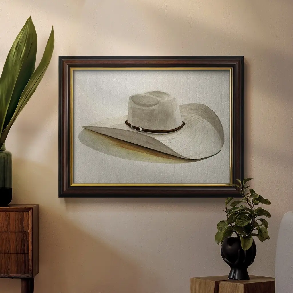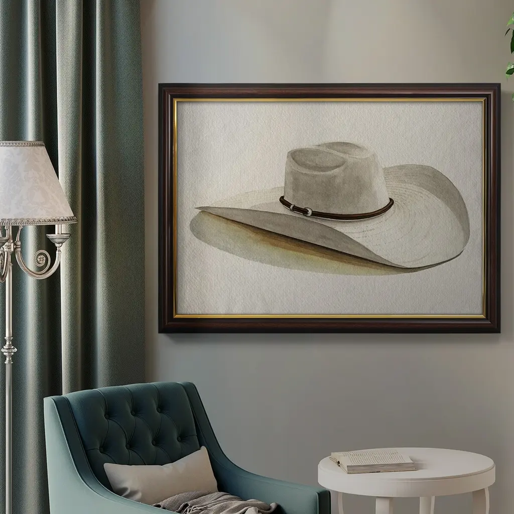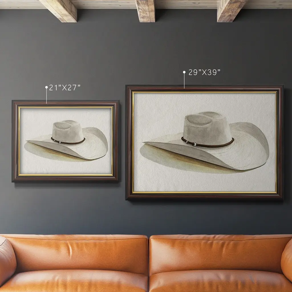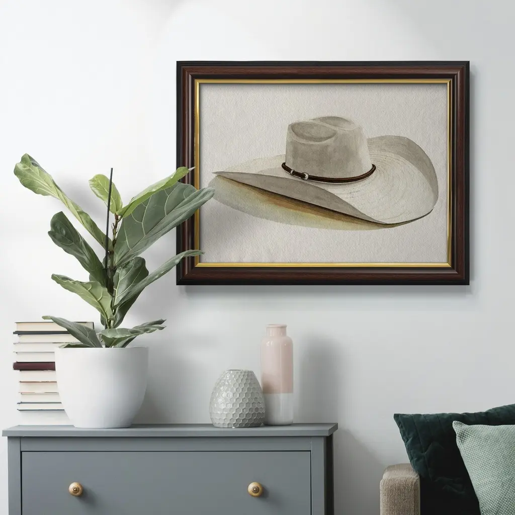 Cowboy Hat II Premium Framed Canvas- Ready to Hang A Premium Framed Canvas created to last. Framed in distressed wood and available in an array of sizes and colors Featuring a beveled a solid wood stretcher bar, each piece comes ready to hand 3 SIZES AVAILABLE 16''X20'' - Overall Size 18'X27'' - Overall Size 24''x36'' - Overall Size Each piece is made to order. Each piece comes with hanging hardware. Made in the USA Ready to Hang Giclee Paper Print Acrylic Glass Beveled Matt Board