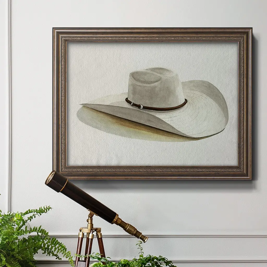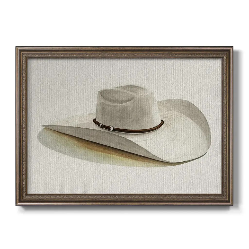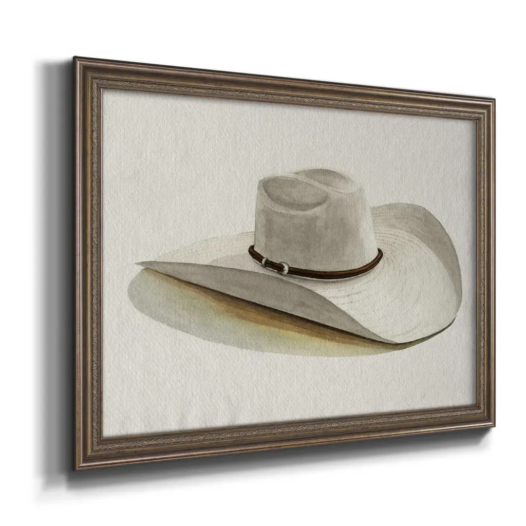 Cowboy Hat II Premium Framed Canvas- Ready to Hang A Premium Framed Canvas created to last. Framed in distressed wood and available in an array of sizes and colors Featuring a beveled a solid wood stretcher bar, each piece comes ready to hand 3 SIZES AVAILABLE 16''X20'' - Overall Size 18'X27'' - Overall Size 24''x36'' - Overall Size Each piece is made to order. Each piece comes with hanging hardware. Made in the USA Ready to Hang Giclee Paper Print Acrylic Glass Beveled Matt Board