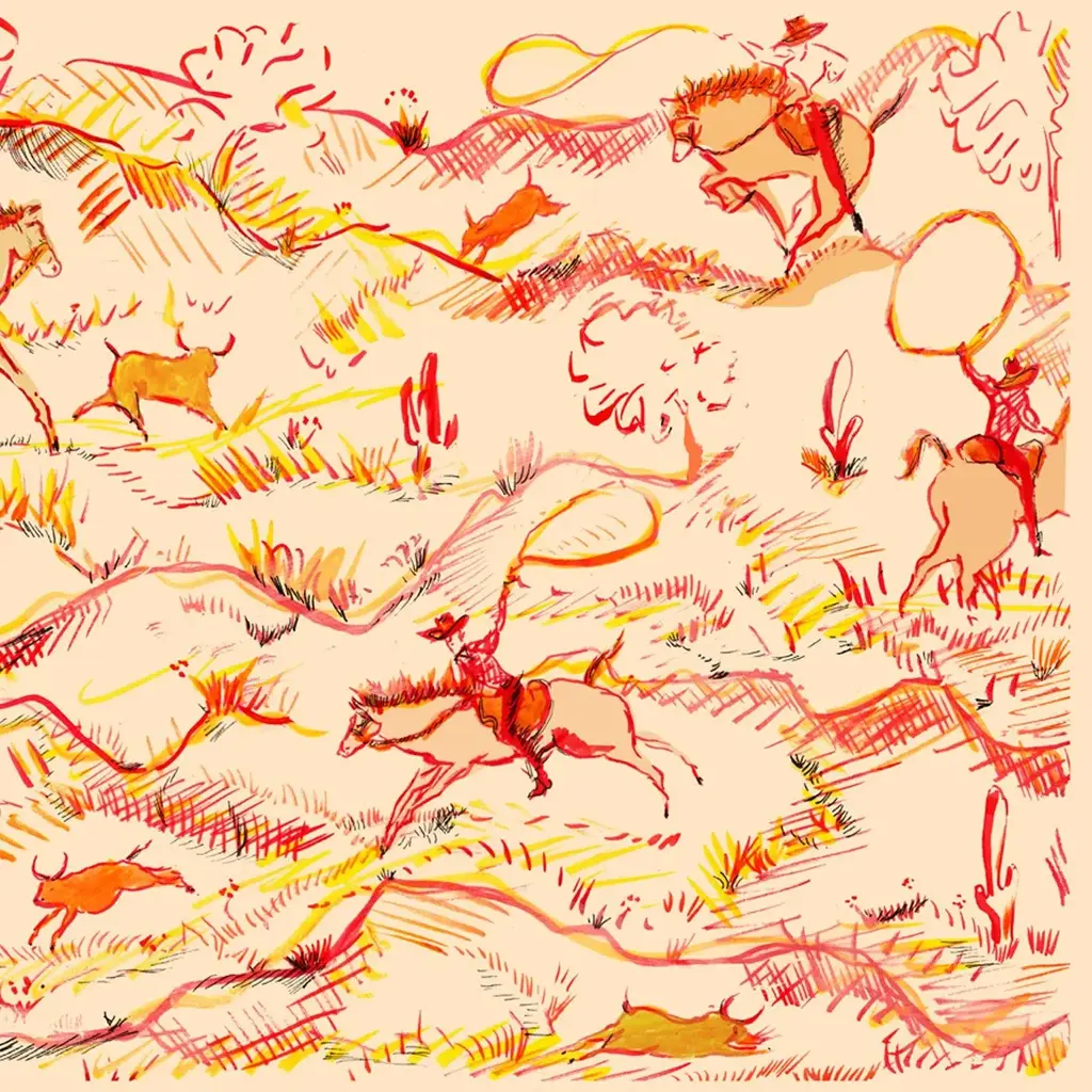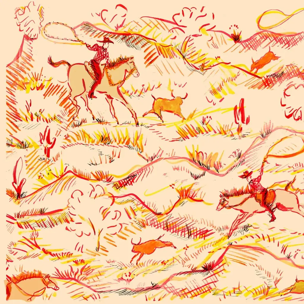 A western scene of cowboys wrangling cattle in a desert landscape.