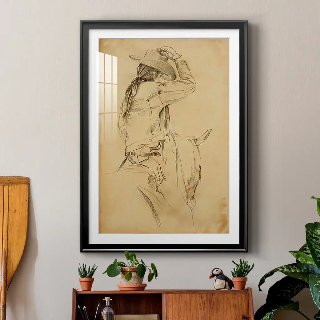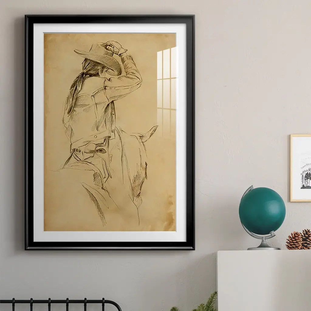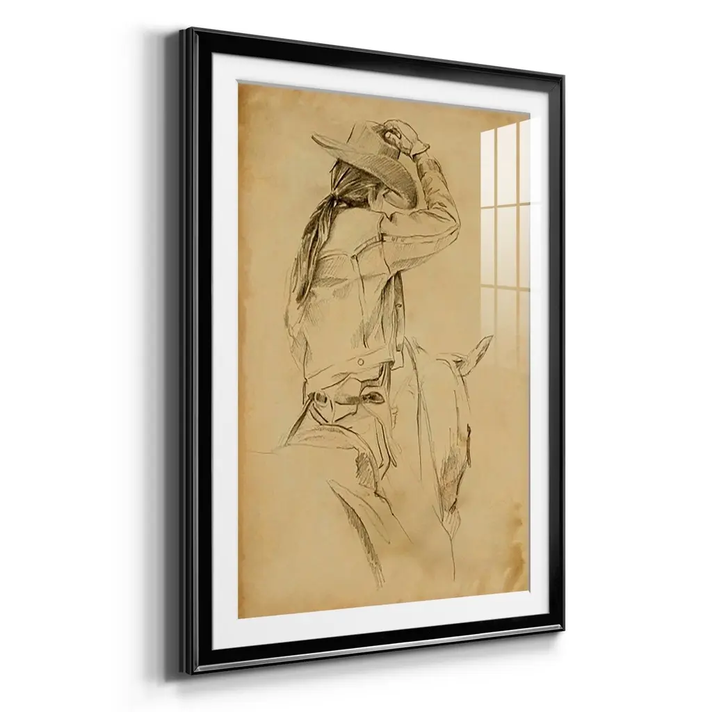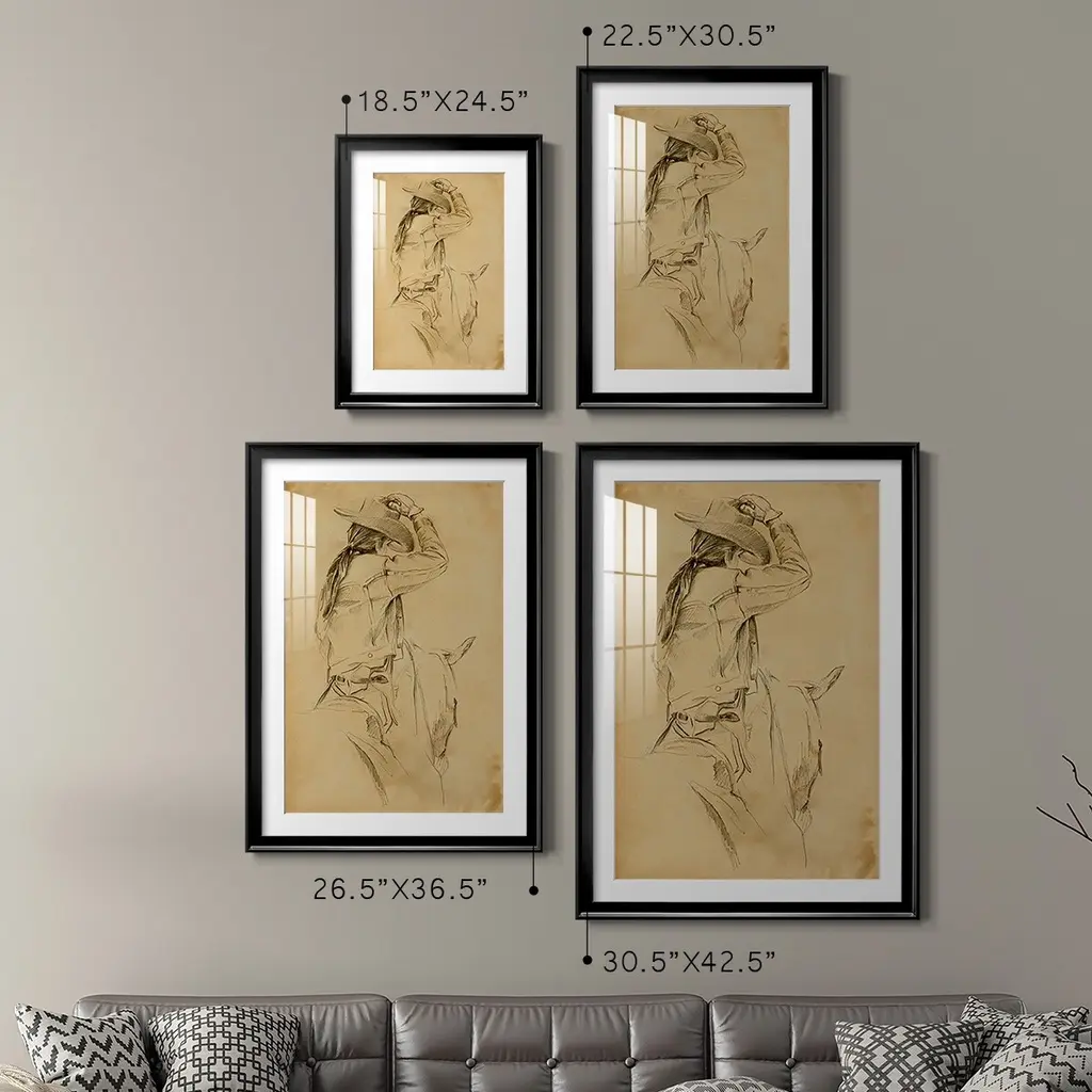 Cowgirl on Horseback II Premium Framed Print - Ready to Hang A Premium Framed Print created to last. Framed in distressed wood and available in an array of sizes and colors Featuring a beveled a solid wood stretcher bar, each piece comes ready to hand 4 SIZES AVAILABLE 30.5''X42.5'' - Overall Size 26.5'X36.5'' - Overall Size 22.5''x30.5'' - Overall Size 18.5''x24.5'' - Overall Size Each piece is made to order. Each piece comes with hanging hardware. Made in the USA Ready to Hang Giclee Paper Print Acrylic Glass Beveled Matt Board