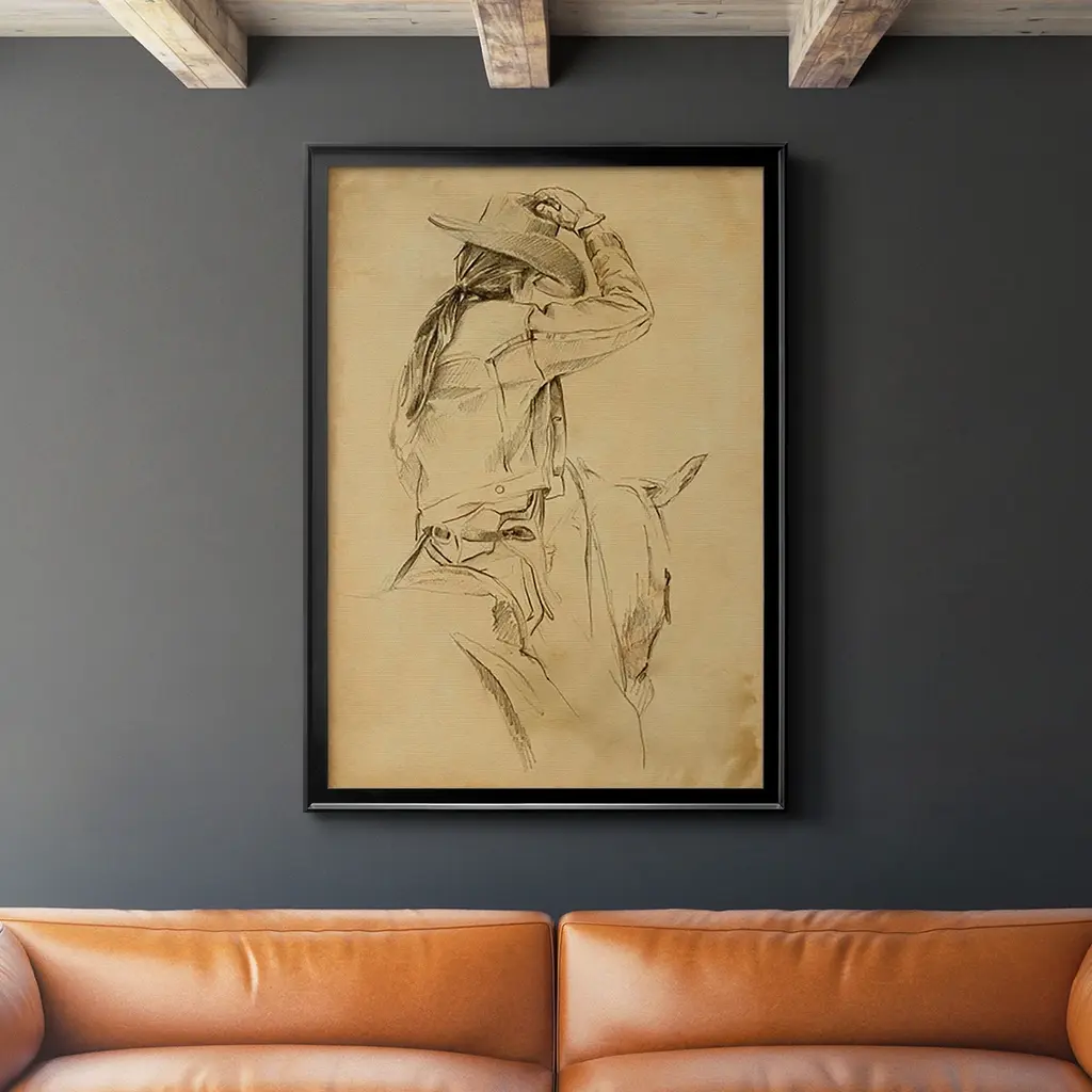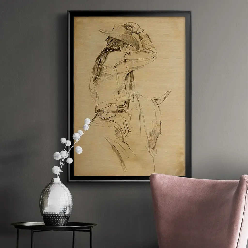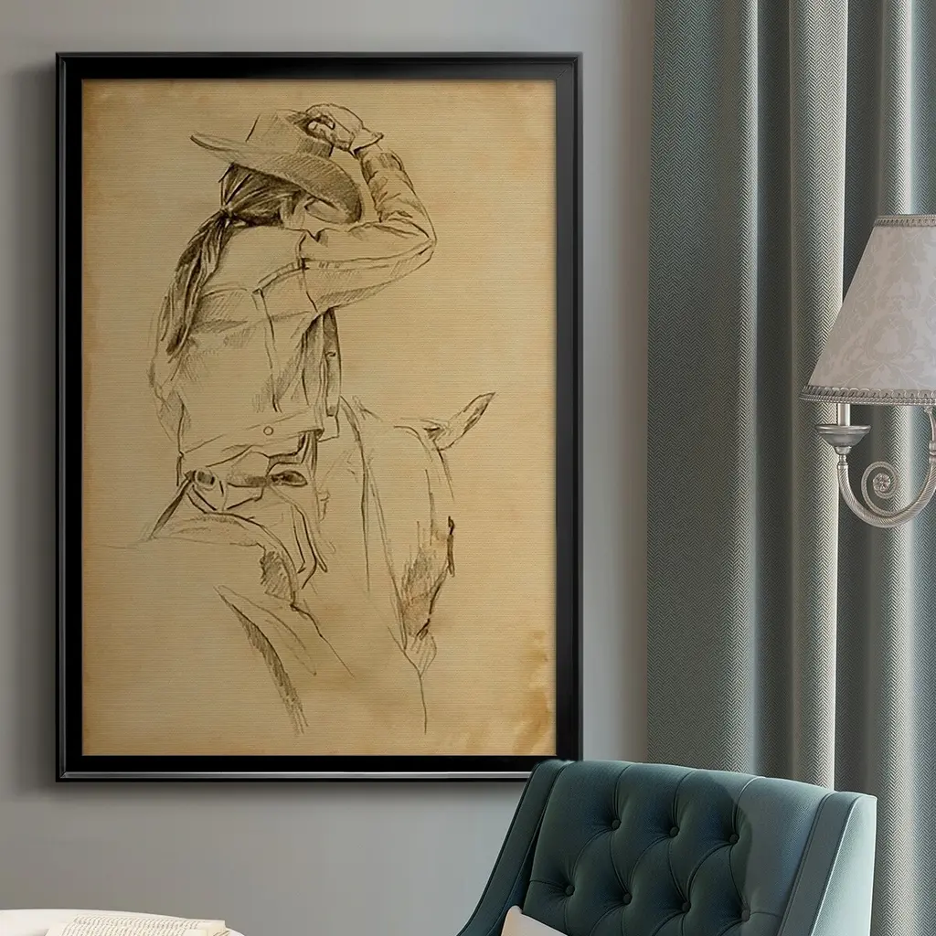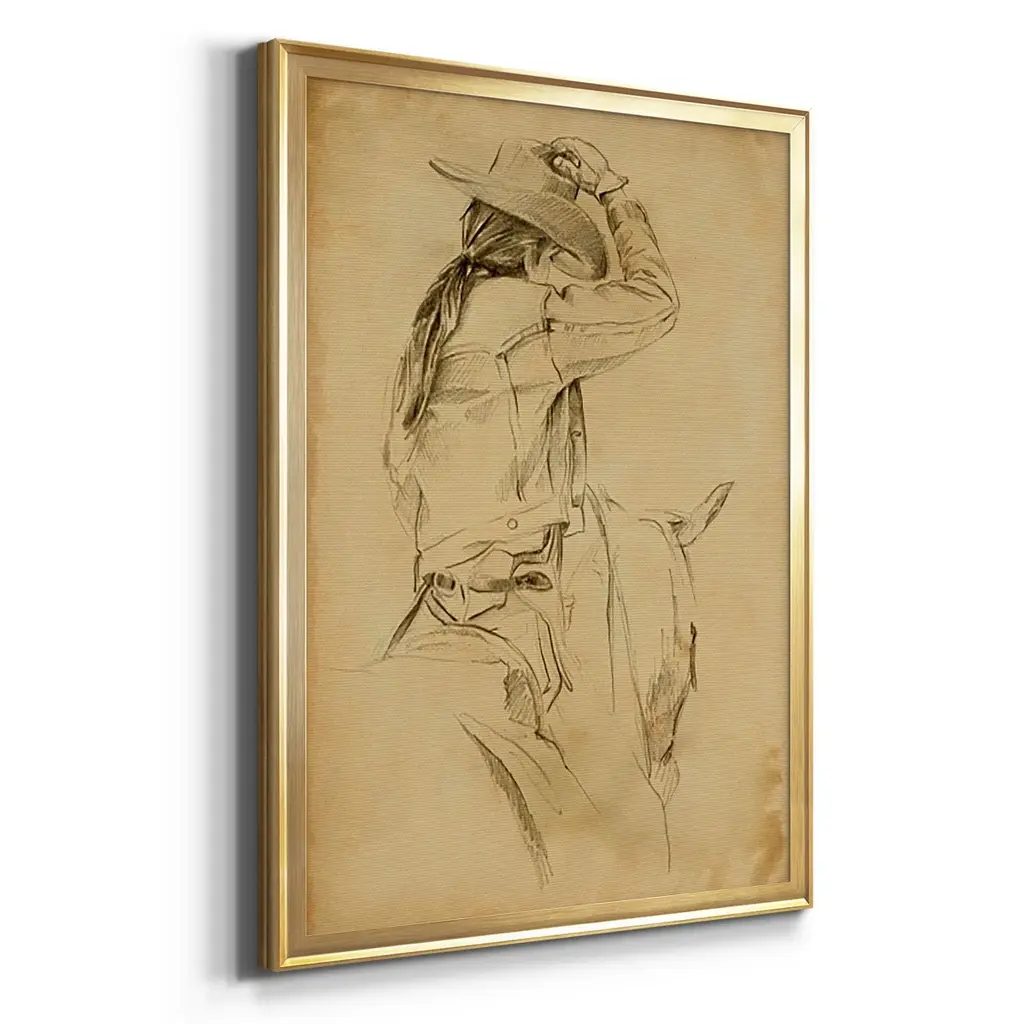 Cowgirl on Horseback II Premium Framed Print - Ready to Hang A Premium Framed Print created to last. Framed in distressed wood and available in an array of sizes and colors Featuring a beveled a solid wood stretcher bar, each piece comes ready to hand 4 SIZES AVAILABLE 30.5''X42.5'' - Overall Size 26.5'X36.5'' - Overall Size 22.5''x30.5'' - Overall Size 18.5''x24.5'' - Overall Size Each piece is made to order. Each piece comes with hanging hardware. Made in the USA Ready to Hang