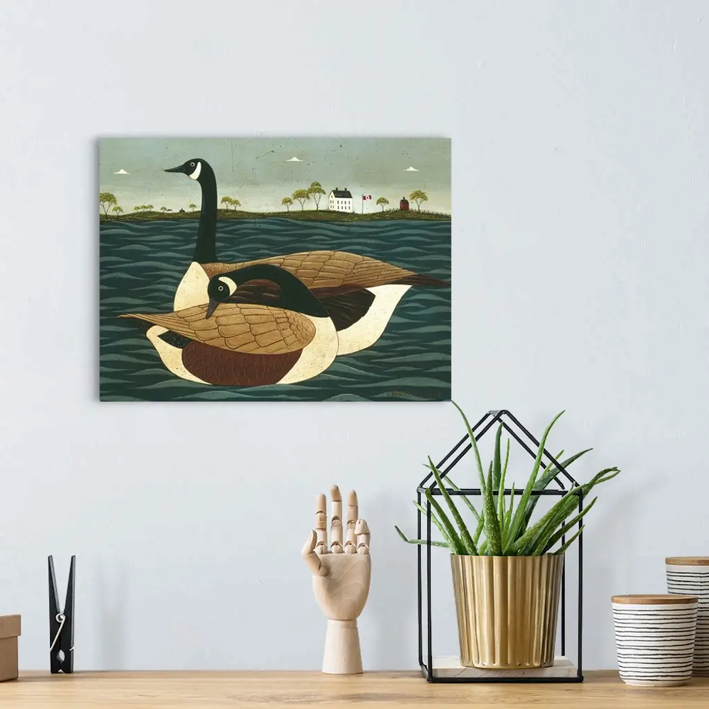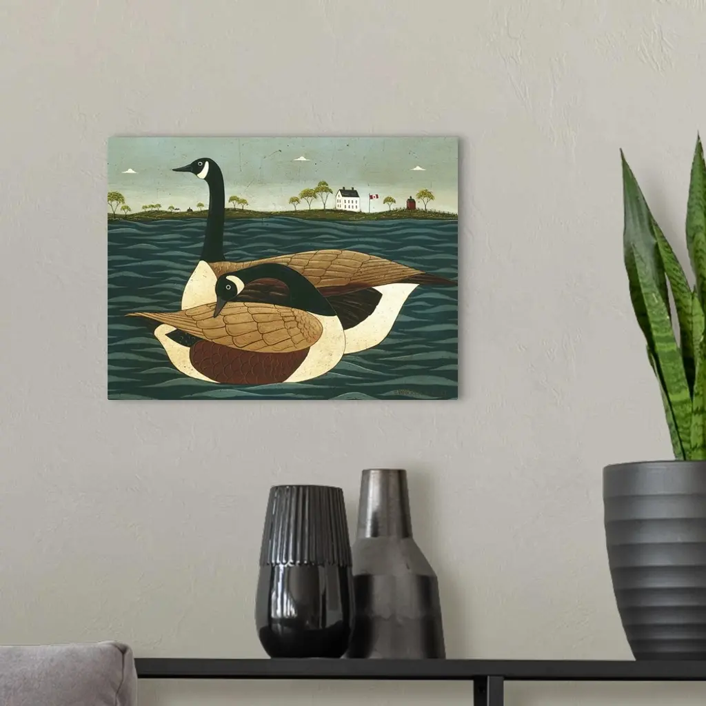 Painting on canvas of two geese floating in the water with land in the background.
