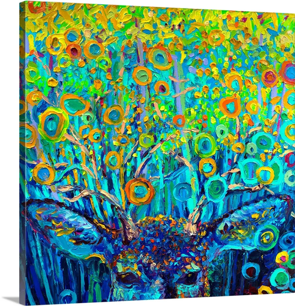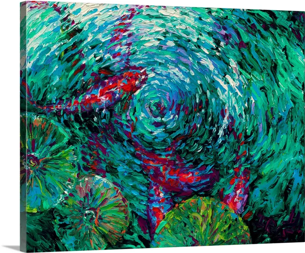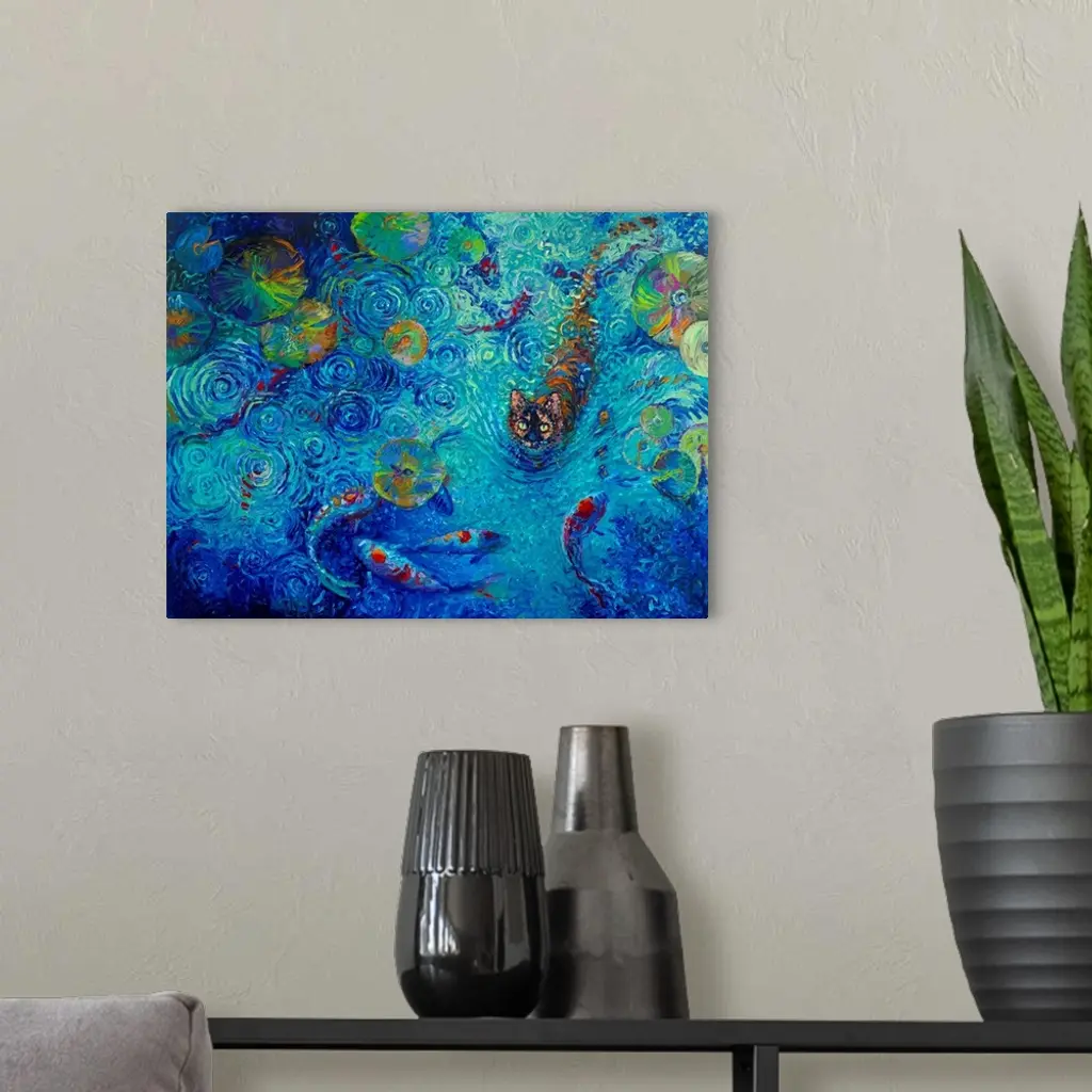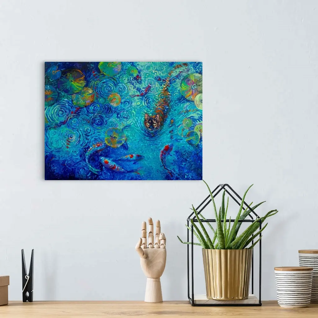 Brightly colored contemporary artwork of a kitty in a koi fish pond.