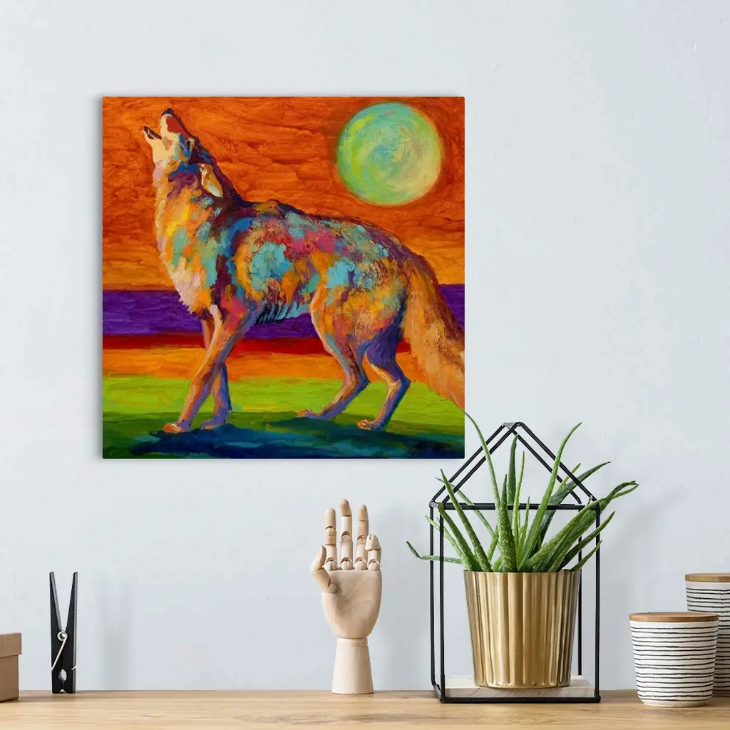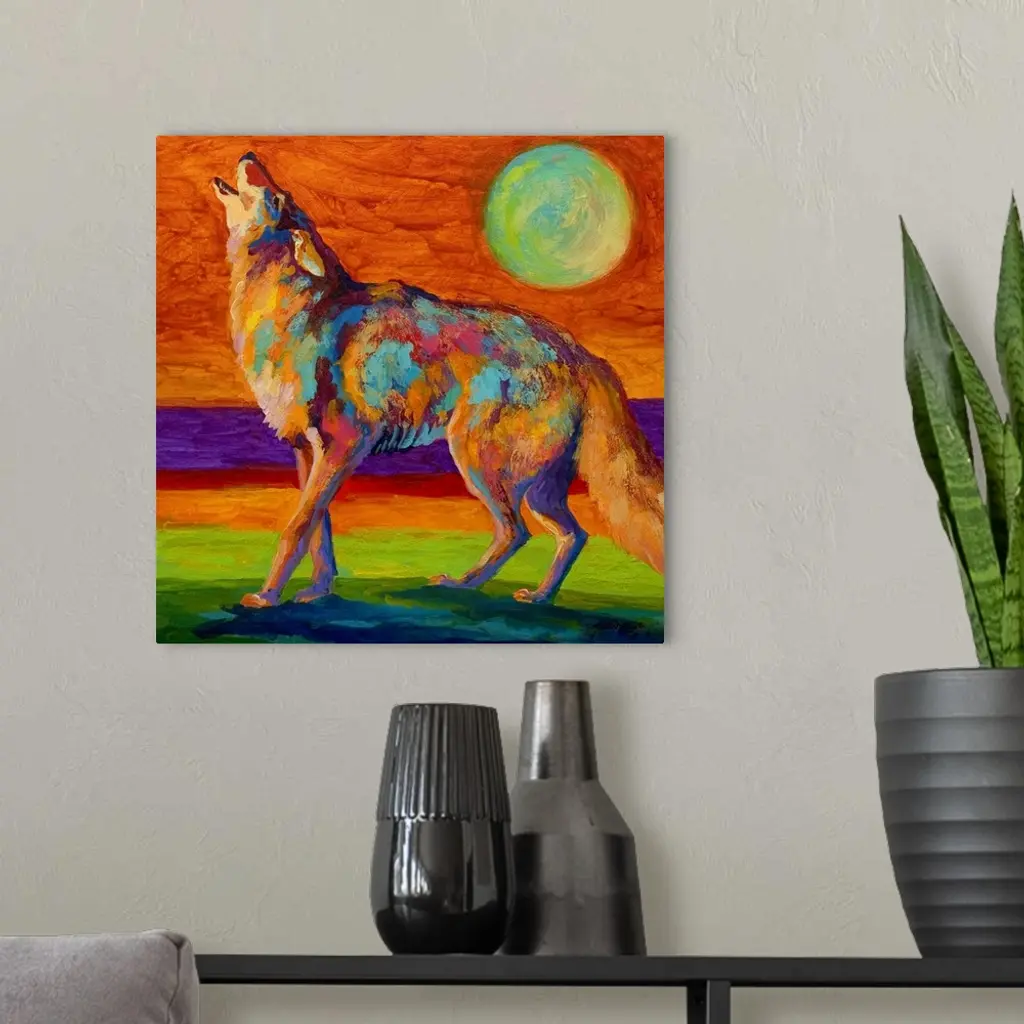 Square, oversized contemporary painting of a wolf standing on a rocky ledge, howling at the sky beneath a full moon. Painted with thick, textured brushstrokes in vibrant colors.