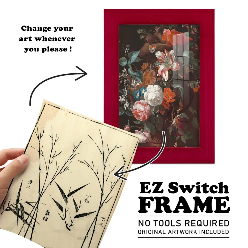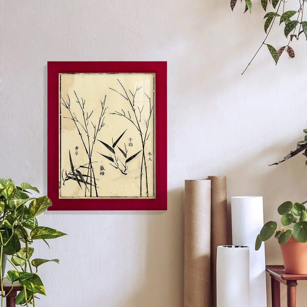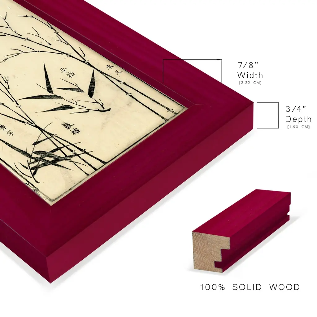 Crackled Bamboo Woodblock II -EZ SWITCH Framed Print w/glass-Cherry Red A delightful, framed print. Featuring a solid wood frame with real wood glass. This premium print is giclee quality. In addition, every frame features a removable back and table top stand. This allows you to change your art in the future or to just stand the art on a table for a new look. We are sure you'll enjoy our new series of EZ SWITCH Framed Art. Solid Wood Frame Real Glass Removable / Replaceable Art Built in Tabletop Stand Sizes range from 4x6 up to 12x15 - buy just one or pair them up as sets as you see fit.