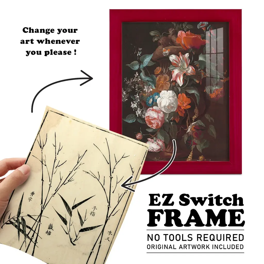 Crackled Bamboo Woodblock II -EZ SWITCH Framed Print w/glass-Cherry Red A delightful, framed print. Featuring a solid wood frame with real wood glass. This premium print is giclee quality. In addition, every frame features a removable back and table top stand. This allows you to change your art in the future or to just stand the art on a table for a new look. We are sure you'll enjoy our new series of EZ SWITCH Framed Art. Solid Wood Frame Real Glass Removable / Replaceable Art Built in Tabletop Stand Sizes range from 4x6 up to 12x15 - buy just one or pair them up as sets as you see fit.