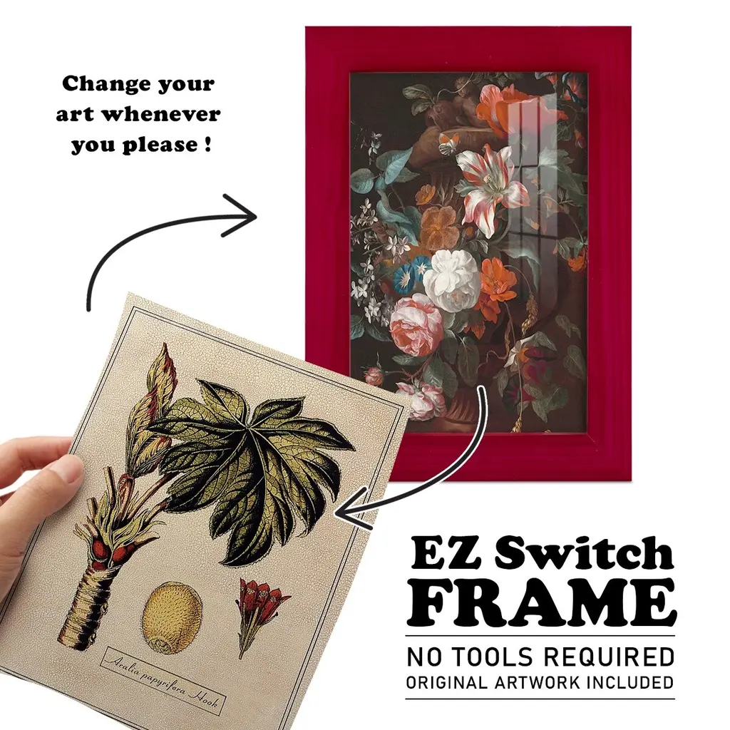 Crackled Paradise Foliage III -EZ SWITCH Framed Print w/glass-Cherry Red A delightful, framed print. Featuring a solid wood frame with real wood glass. This premium print is giclee quality. In addition, every frame features a removable back and table top stand. This allows you to change your art in the future or to just stand the art on a table for a new look. We are sure you'll enjoy our new series of EZ SWITCH Framed Art. Solid Wood Frame Real Glass Removable / Replaceable Art Built in Tabletop Stand Sizes range from 4x6 up to 12x15 - buy just one or pair them up as sets as you see fit.