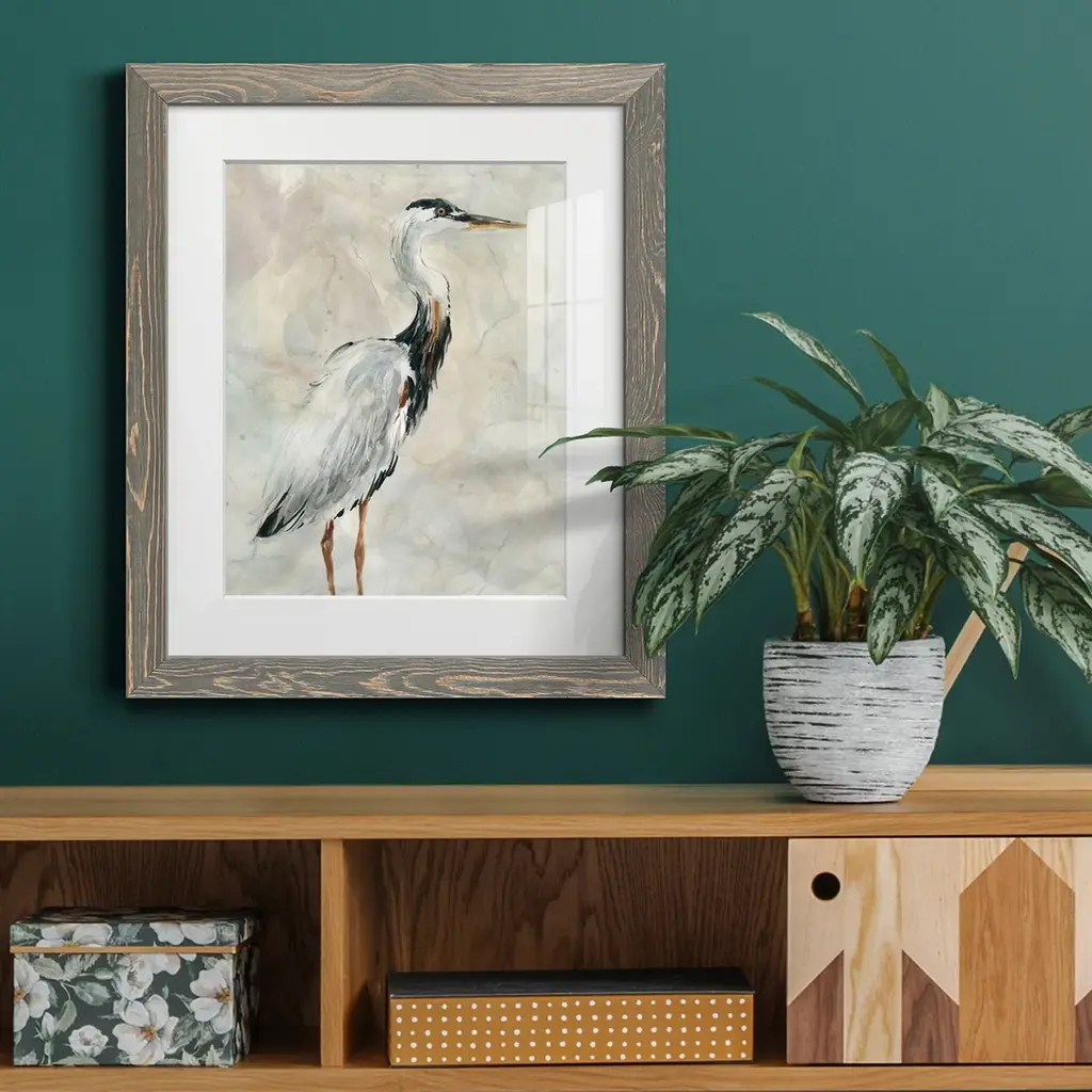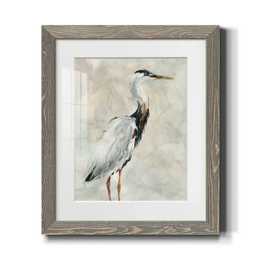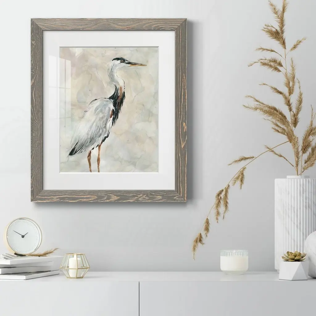 Crane at Dusk I-Premium Framed Print - Ready to Hang Framed in distressed wood and available in an array of sizes and colors Each piece is joined and assembled by hand and comes ready to hang 2 INCH BEVELED MATTE BOARD PLEXIGLASS COVERING READY TO HANG MADE IN THE USA SOLID WOOD FRAME MADE IN USA FADE RESISTANT GICLEE PRINTING on Canvas or Paper