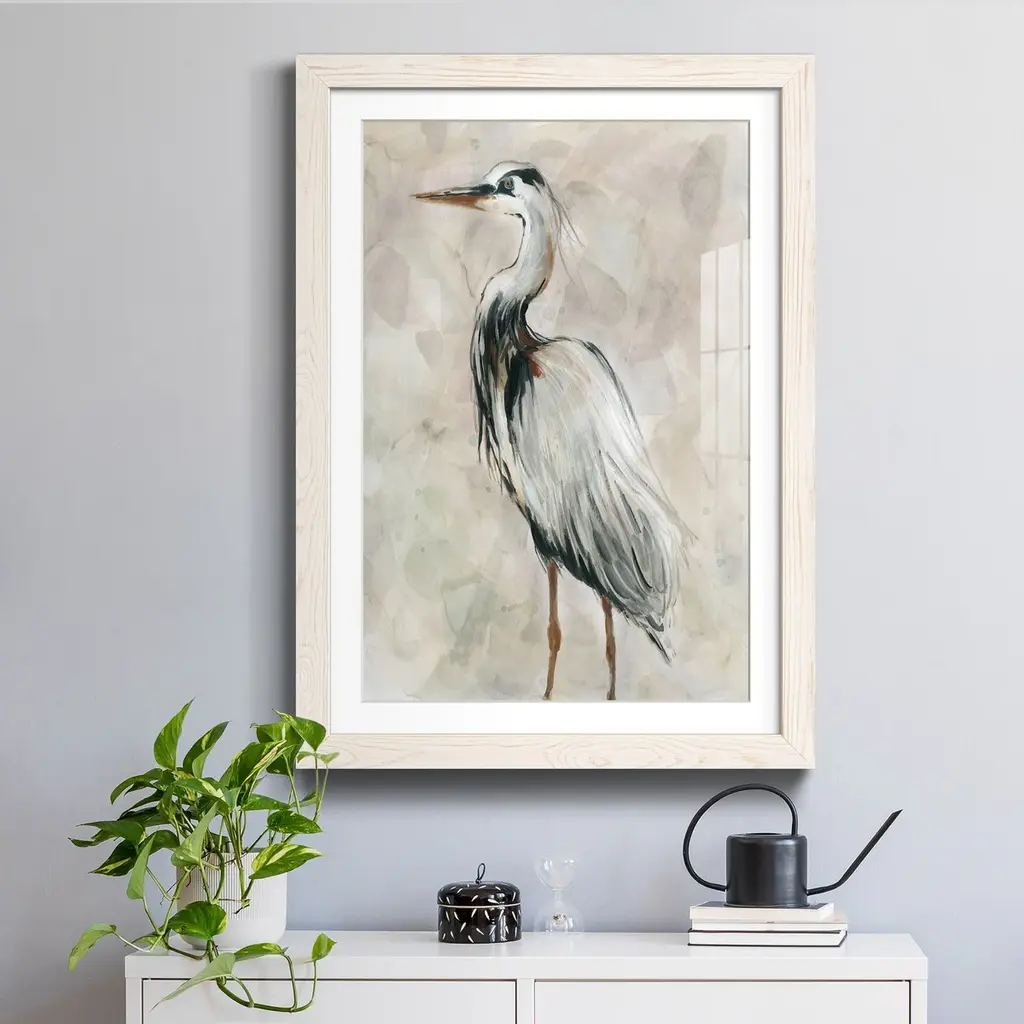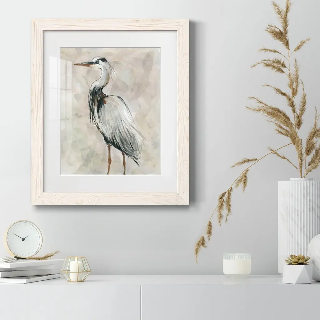 Crane at Dusk II-Premium Framed Print - Ready to Hang Framed in distressed wood and available in an array of sizes and colors Each piece is joined and assembled by hand and comes ready to hang 2 INCH BEVELED MATTE BOARD PLEXIGLASS COVERING READY TO HANG MADE IN THE USA SOLID WOOD FRAME MADE IN USA FADE RESISTANT GICLEE PRINTING on Canvas or Paper