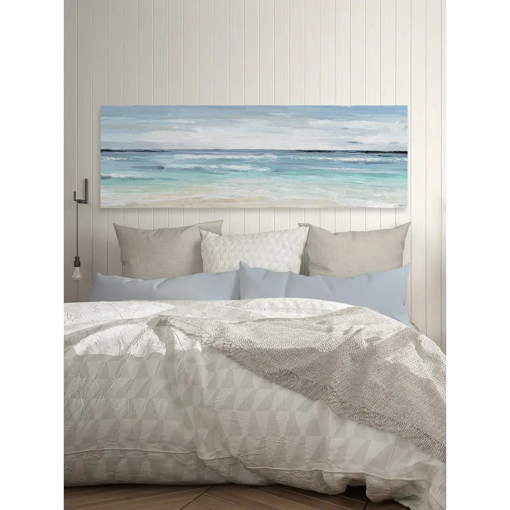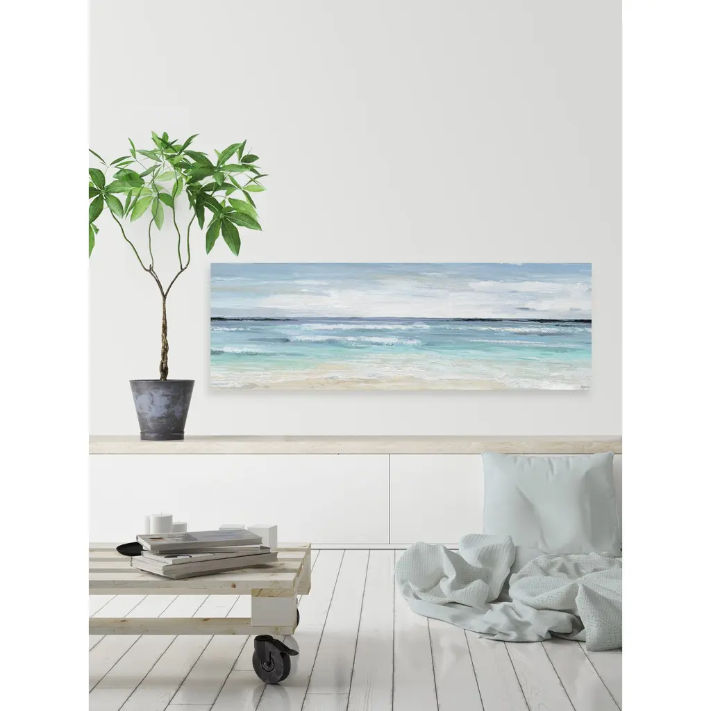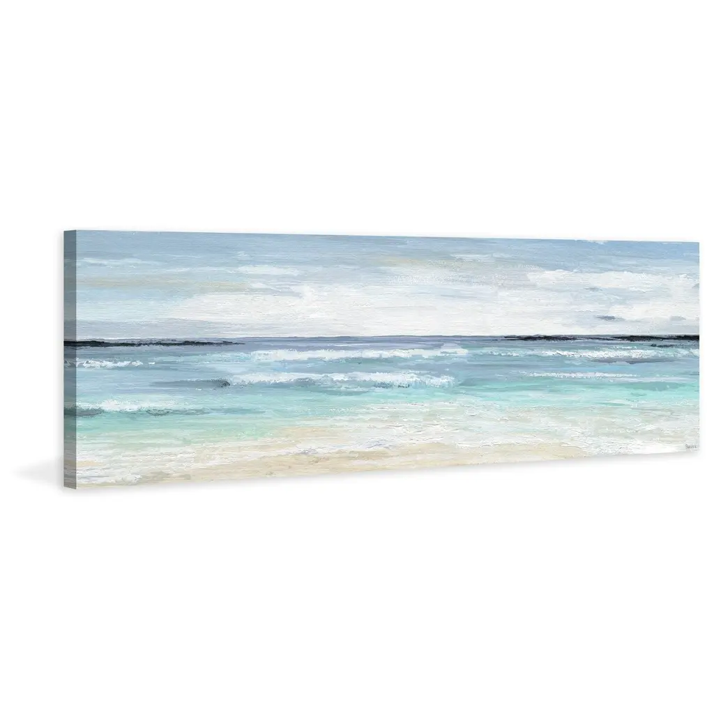 As the deepest tones of blue on the horizon soften as they reach the shore you can practically hear the waves crash against the shore in the marvelous acrylic piece. Let the panoramic view lead your eye across the horizon of the peaceful beachscape. Proudly made in the USA, this piece is printed on canvas before it's stretched over non-warping wooden bars for a gallery-wrapped look. With wall-mounting hooks included, this artful accent is ready to hang up as soon as it reaches your front door. • Fine art canvas print by Parvez Taj • Professionally hand stretched • Gallery wrapped in sustainable, non-warping wood • Arrives ready to hang • Made in the USA • Includes a certificate of authenticity • Artist signature on the front