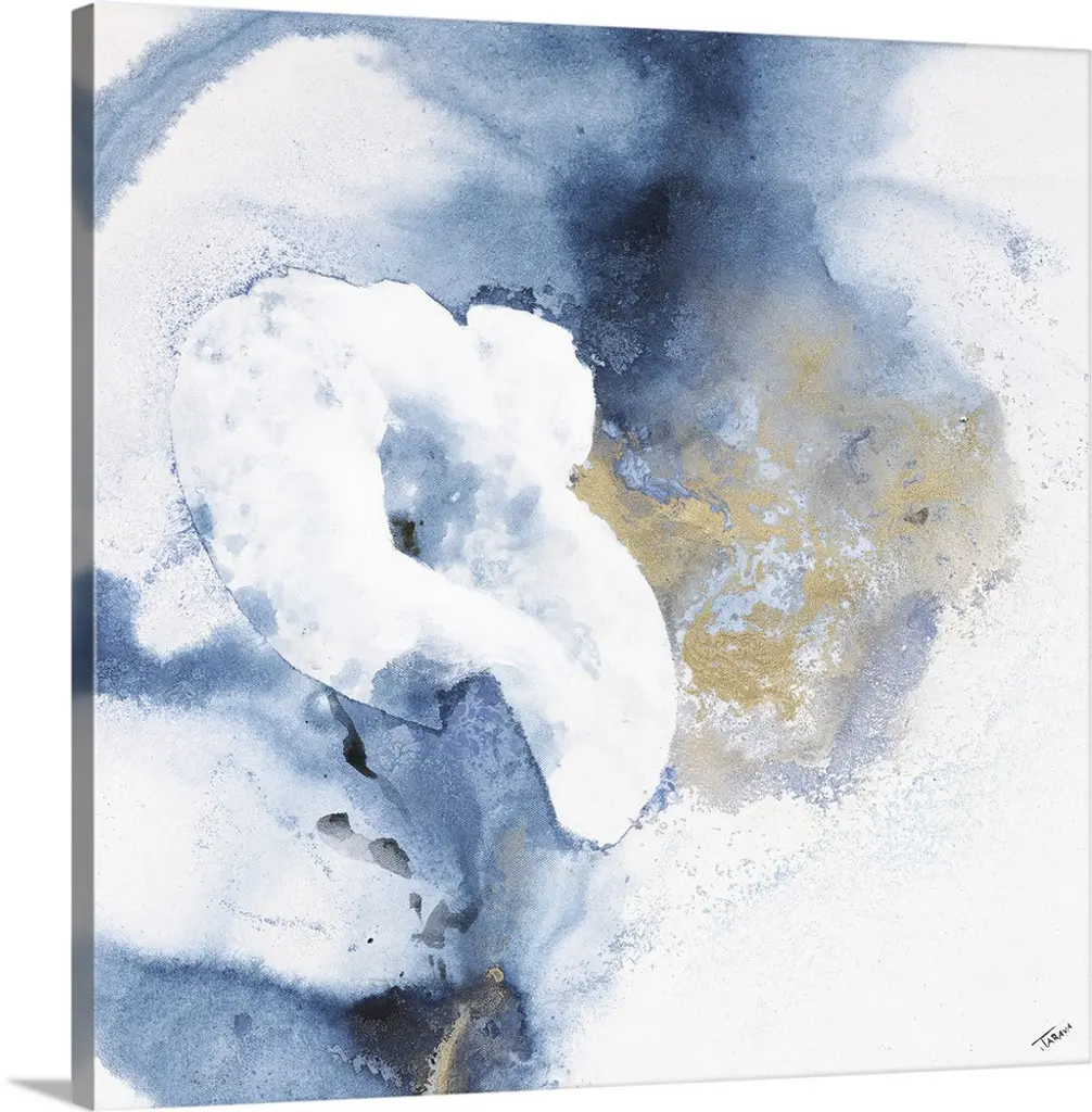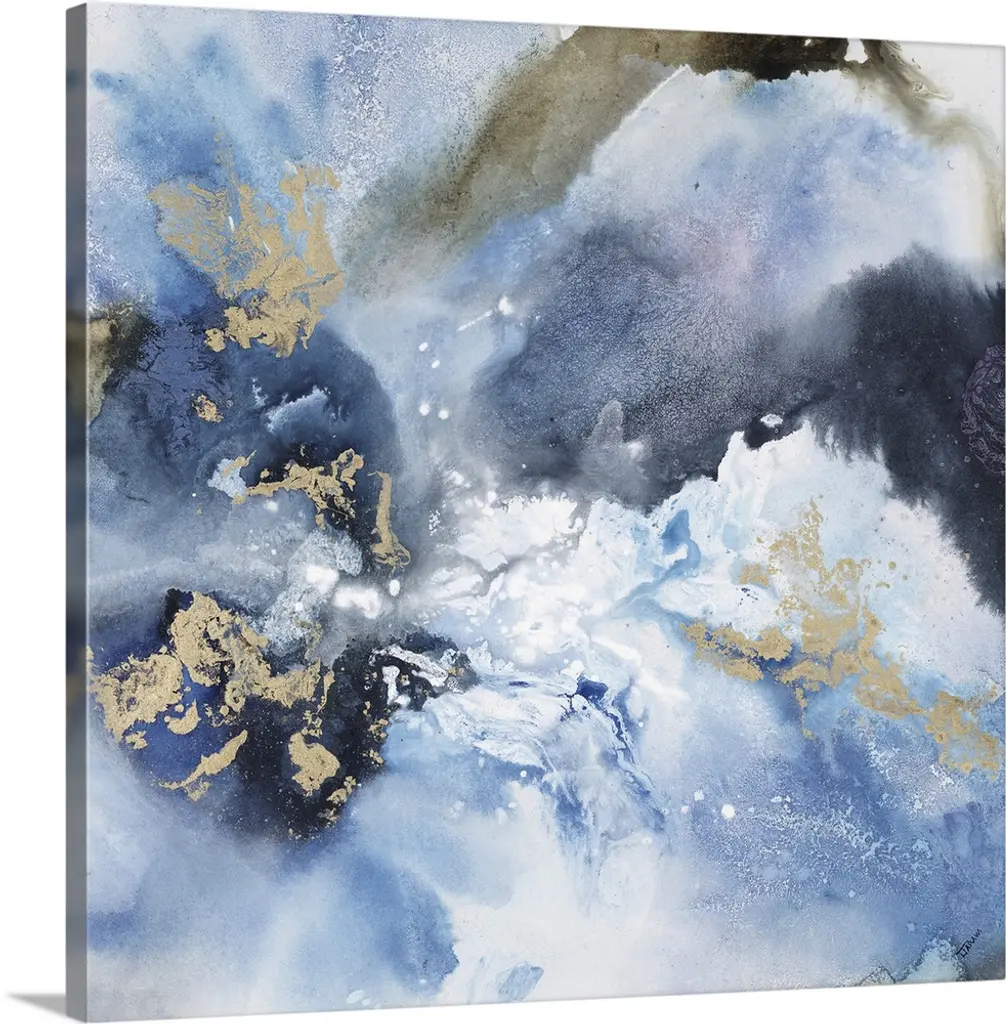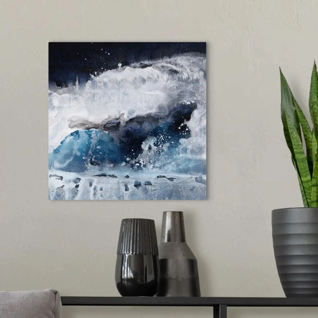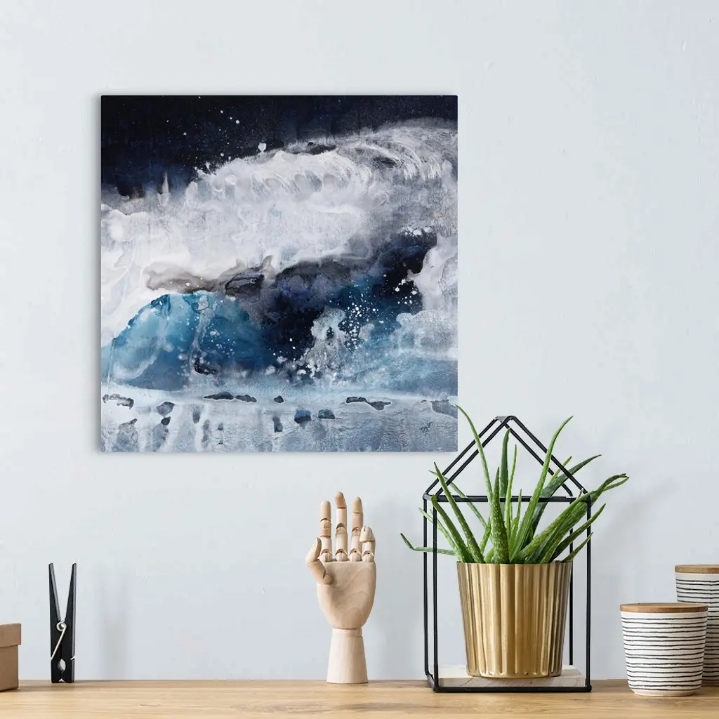 Contemporary abstract painting of what looks like crashing blue and white waves of ocean water.