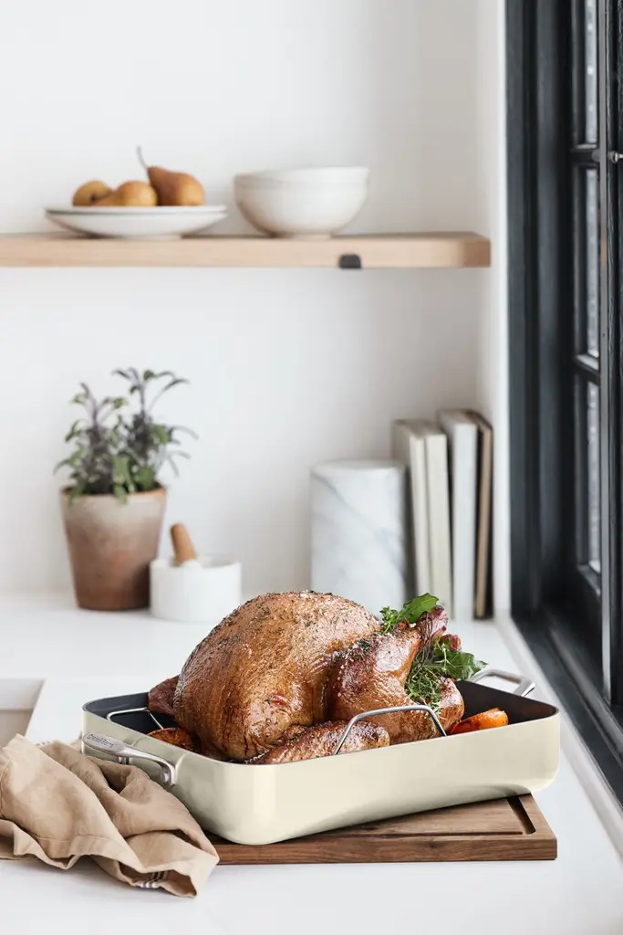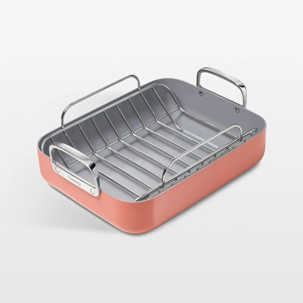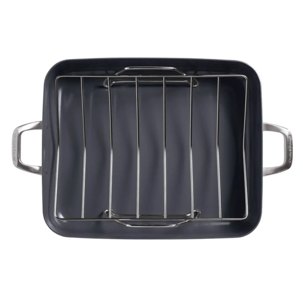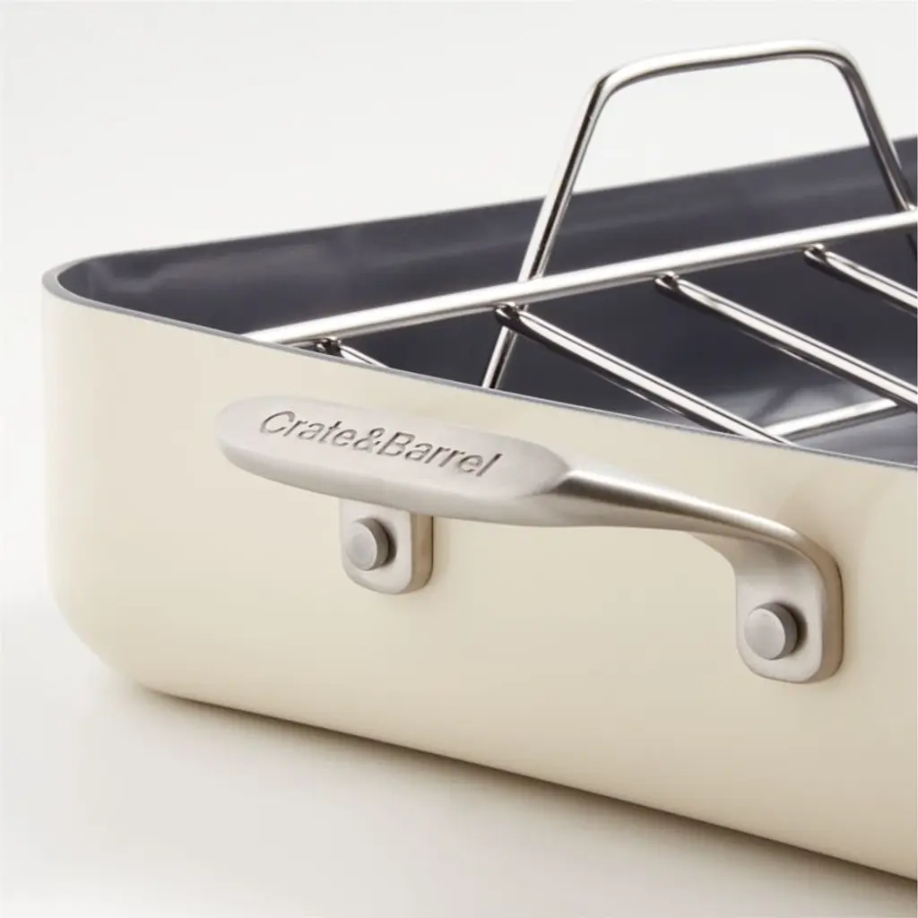 Our exclusive cookware collection has been scrutinized at every stage to bring you the heirloom quality and refined look your kitchen deserves. This roasting pan with a stainless steel rack goes from oven to stovetop to table effortlessly for a classic presentation of turkeys, hams or standing rib roasts. Made of specially treated EvenCook Ceramic hard-anodized aluminum, the cream-colored roaster provides even heat control for superior performance. The non-stick cooking surface has a diamond-infused ceramic coating that easilyreleases foods and cleans up easily. Ergonomically considered handles feel comfortable and balanced and are secured with smooth-profile rivets for easy cleaning after family feasts and holiday get-togethers.Direct from our design team to your kitchen, the sophisticated assortment in our signature The Kitchen by Crate line combines beautiful simplicity and peerless performance. From initial sketches to rigorous testing, every expertly designed product in this kitchen collection meets our standards, and yours.