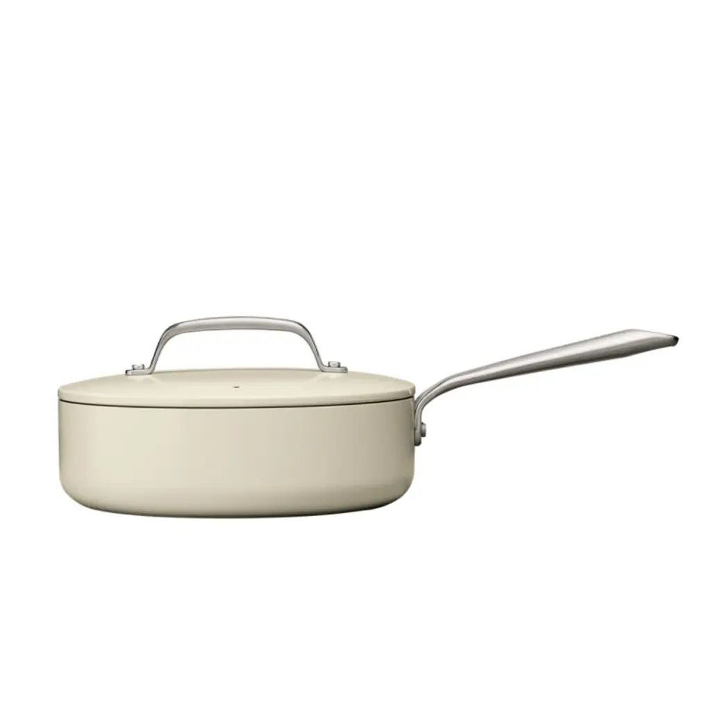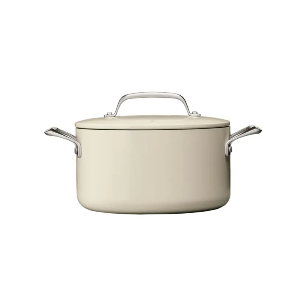 Our exclusive cookware collection has been reviewed at every stage to bring you the heirloom quality and refined look your kitchen deserves. The cream-colored cookware provides even heat control for superior performance. Ideal for browning and searing with less oil, the non-stick cooking surfaces have a diamond-infused ceramic coating that effortlessly releases foods and cleans up easily. The ergonomically considered handles stamped with the Crate & Barrel logo feel comfortable and balanced and are secured with smooth-profile rivets for easy cleaning.Direct from our design team to your kitchen, the sophisticated assortment in our signature The Kitchen by Crate line combines beautiful simplicity and peerless performance. From initial sketches to rigorous testing, every expertly designed product in this kitchen collection meets our standards, and yours.