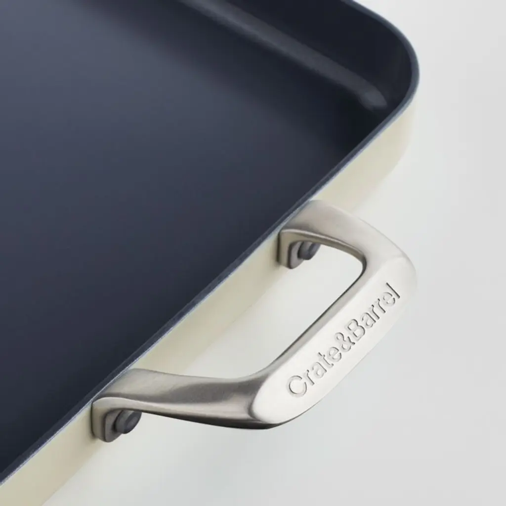 Our exclusive cookware collection has been scrutinized at every stage to bring you the heirloom quality and refined look your kitchen deserves. Designed to span two burners for maximum cooking space, our griddle brings a pop of color to the kitchen with its cream-colored ceramic exterior specially treated to be ultra-durable. The non-stick cooking surface has a diamond-infused ceramic coating that effortlessly releases foods and cleans up easily. Ideal for pancakes, hamburgers and hash, the cream ceramic griddle is oven- and broiler-safe to 500°F.Direct from our design team to your kitchen, the sophisticated assortment in our signature The Kitchen by Crate line combines beautiful simplicity and peerless performance. From initial sketches to rigorous testing, every expertly designed product in this kitchen collection meets our standards, and yours.