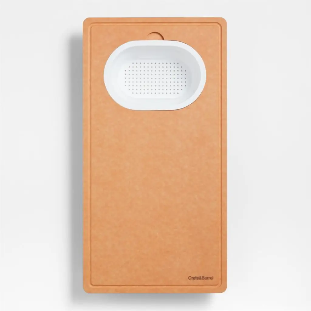 An elevated and highly functional solution for your kitchen, our signature colander and cutting board is specifically designed to sit over your kitchen sink. The white silicone strainer lets you rinse and drain produce before cutting on the board. The colander removes for other tasks and collapses for easy storage. Constructed of a paper composite in a natural hue, the board won't warp, chip or crack for worry-free prepping and cleanup. Small silicone feet on the underside keep the board in place as you work, and a juice groove around the perimeter collects extra liquid.Direct from our design team to your kitchen, the sophisticated assortment in our signature The Kitchen by Crate line combines beautiful simplicity and peerless performance. From initial sketches to rigorous testing, every expertly designed product in this kitchen collection meets our standards, and yours.View all "The Kitchen by Crate" collection