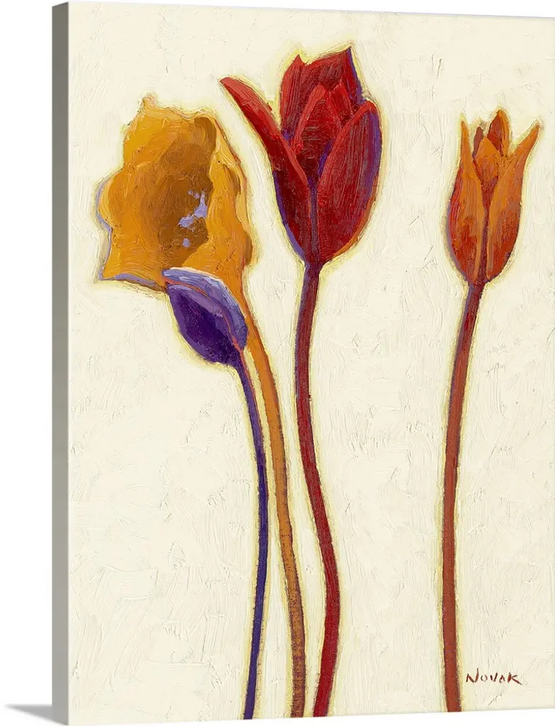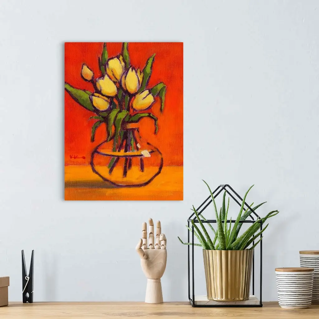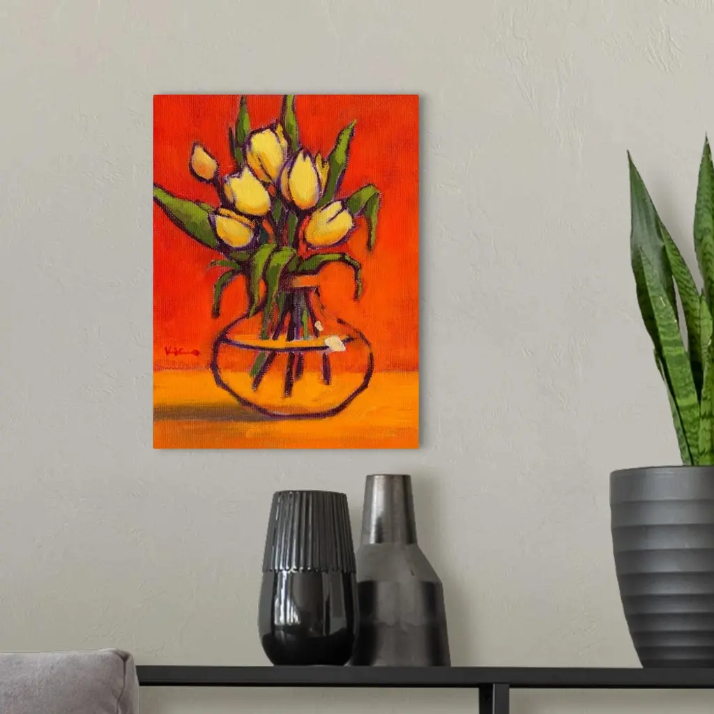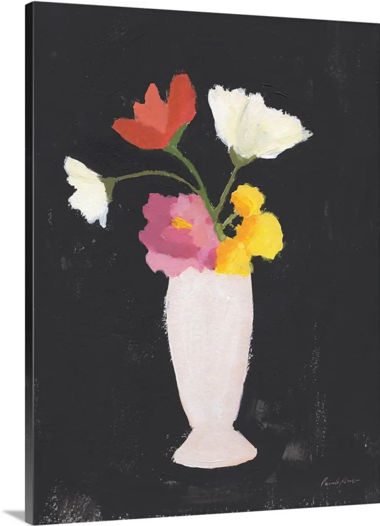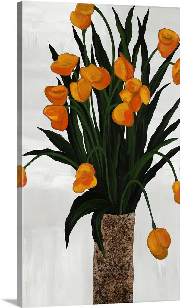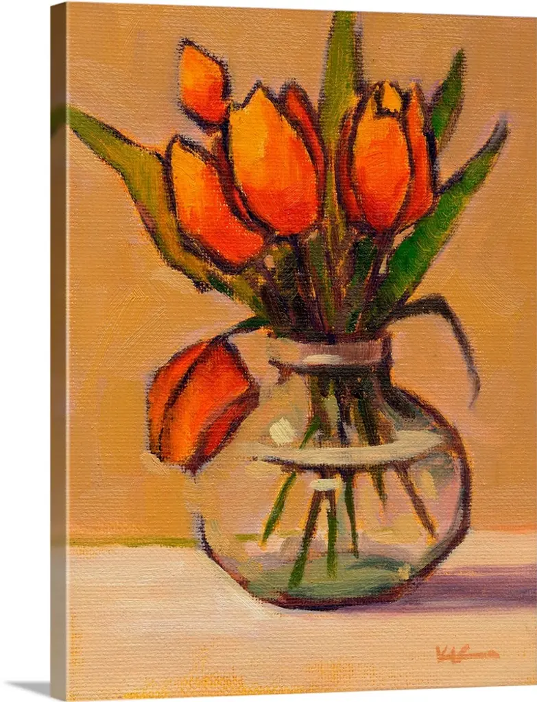 A vertical contemporary painting of a glass vase of eloquent flowers.