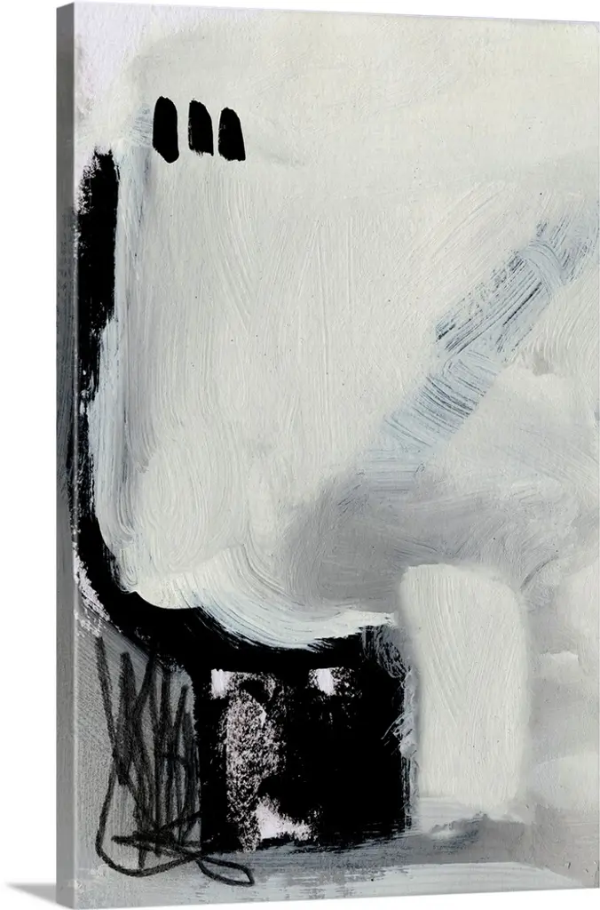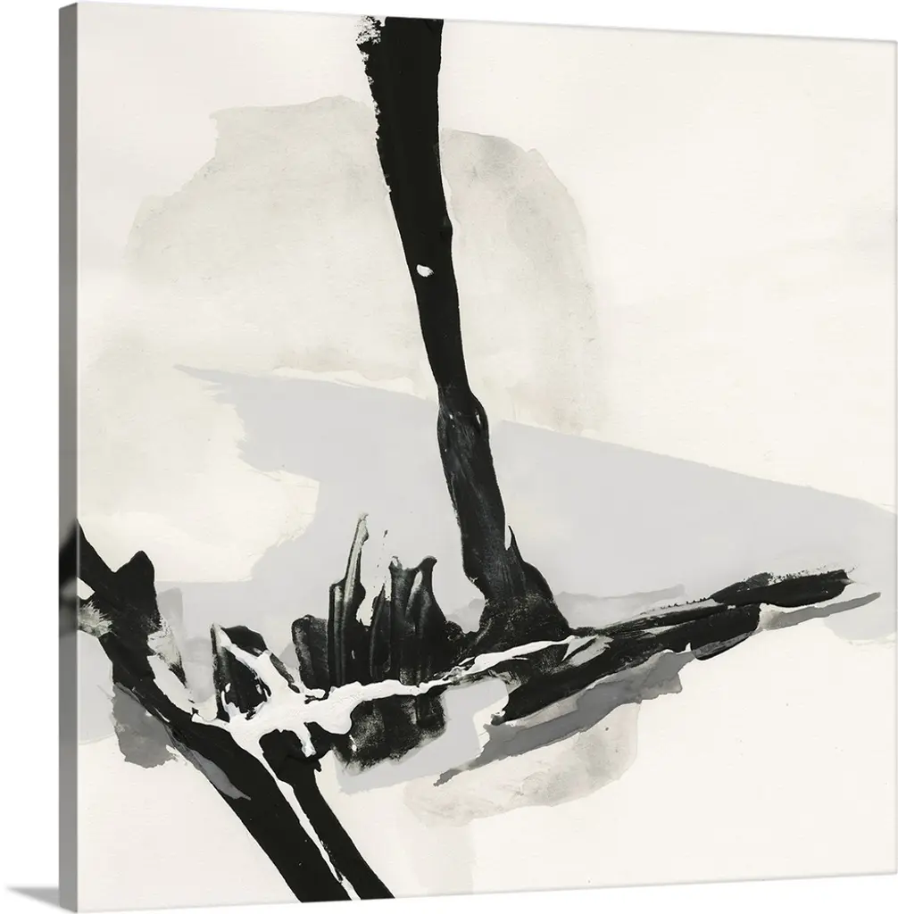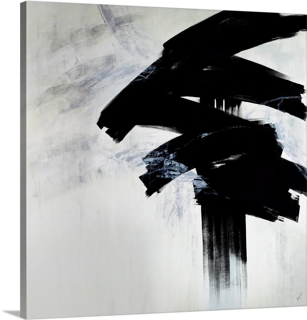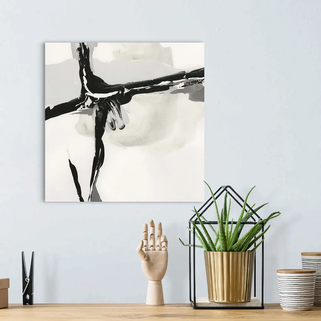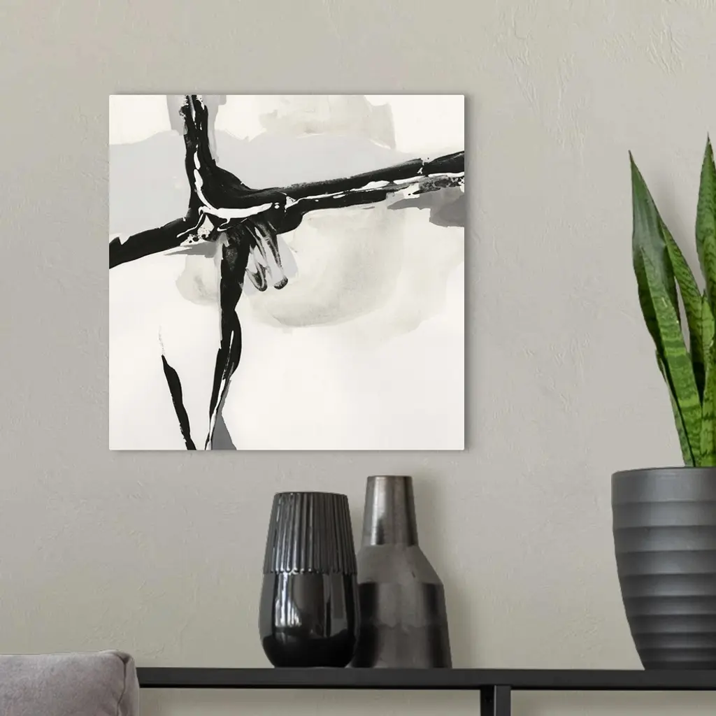 Square black, white, gray, and cream abstract painting with a bold vertical and horizontal thick black lines creating a crisscross shape and movement.