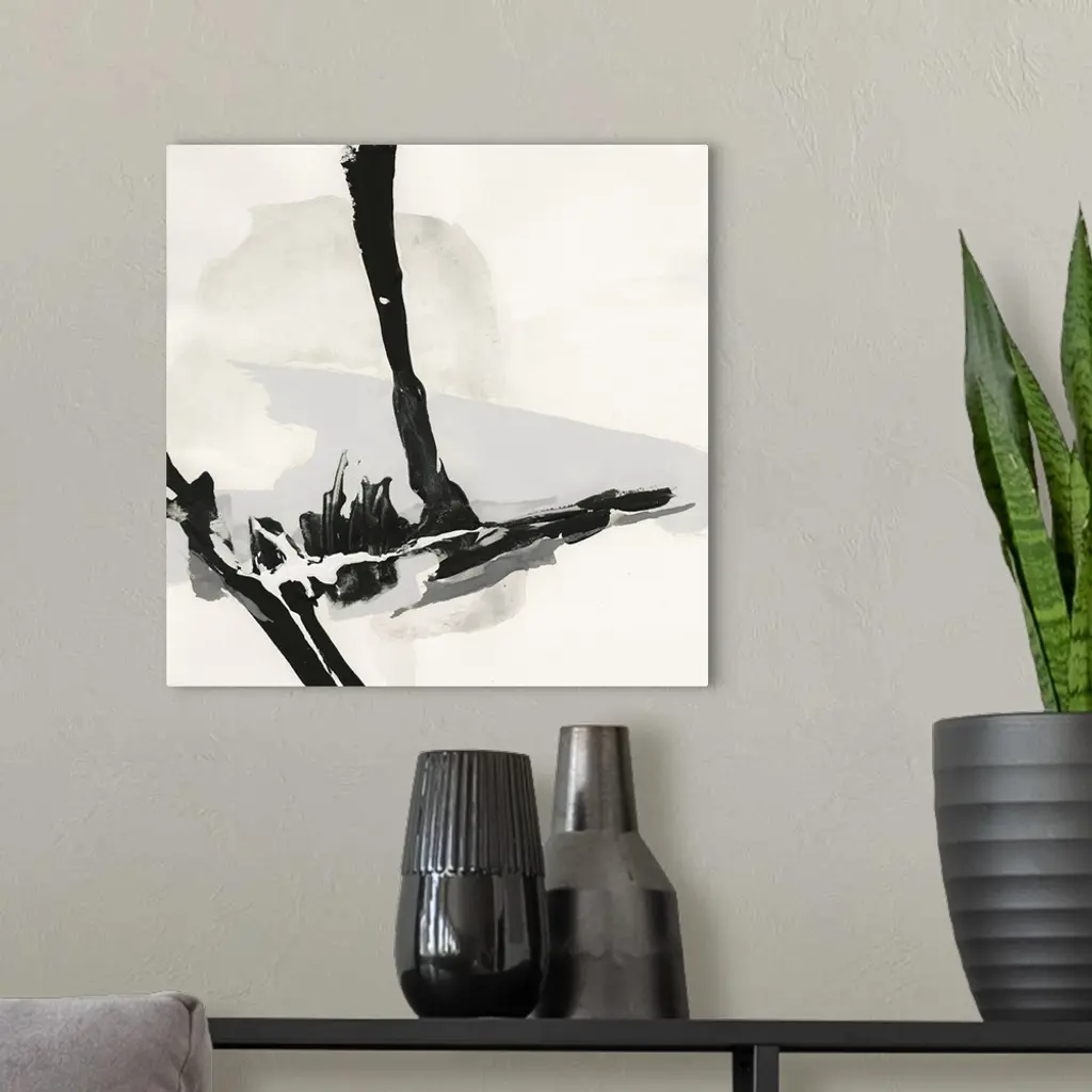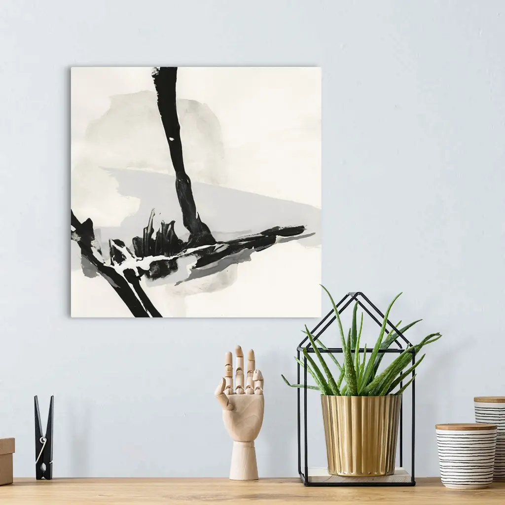 Square black, white, gray, and cream abstract painting with a bold vertical and horizontal thick black lines joined together creating movement.
