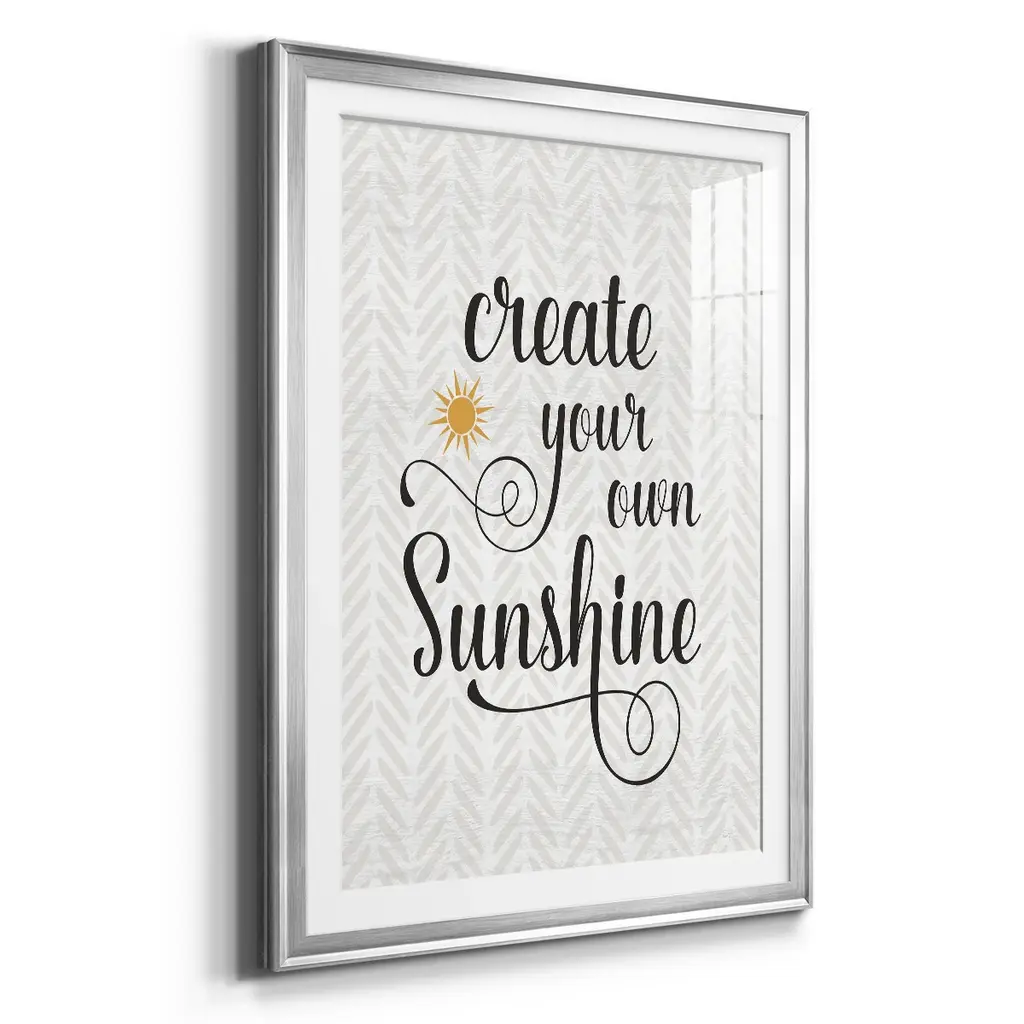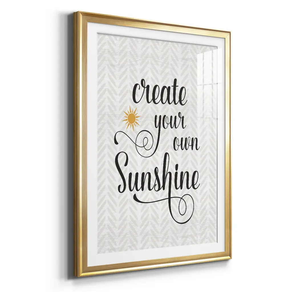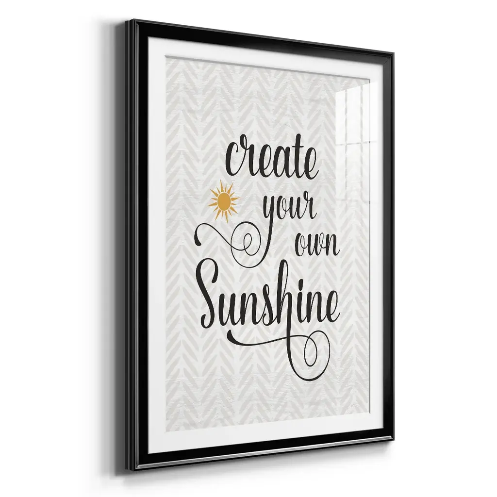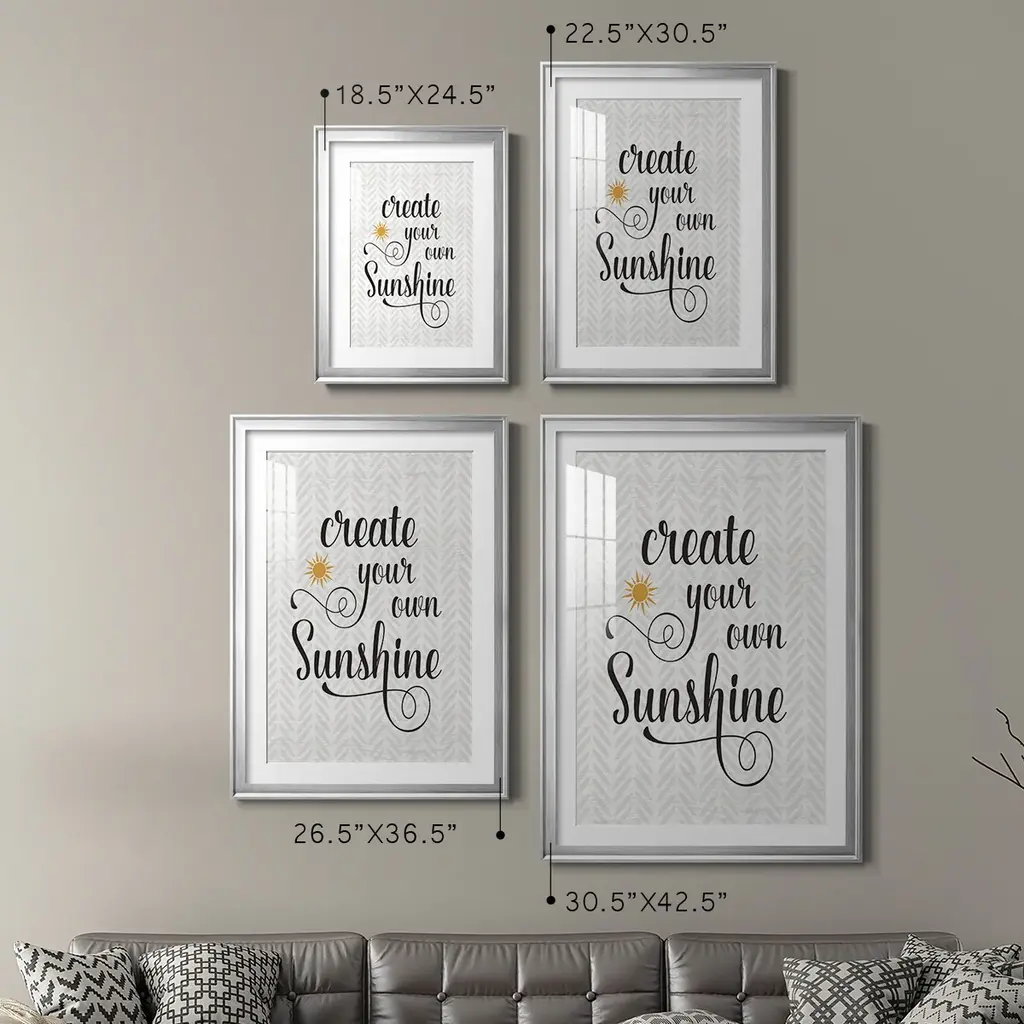 Create Your Own Sunshine Premium Framed Print - Ready to Hang A Premium Framed Print created to last. Framed in distressed wood and available in an array of sizes and colors Featuring a beveled a solid wood stretcher bar, each piece comes ready to hand 4 SIZES AVAILABLE 30.5''X42.5'' - Overall Size 26.5'X36.5'' - Overall Size 22.5''x30.5'' - Overall Size 18.5''x24.5'' - Overall Size Each piece is made to order. Each piece comes with hanging hardware. Made in the USA Ready to Hang Giclee Paper Print Acrylic Glass Beveled Matt Board