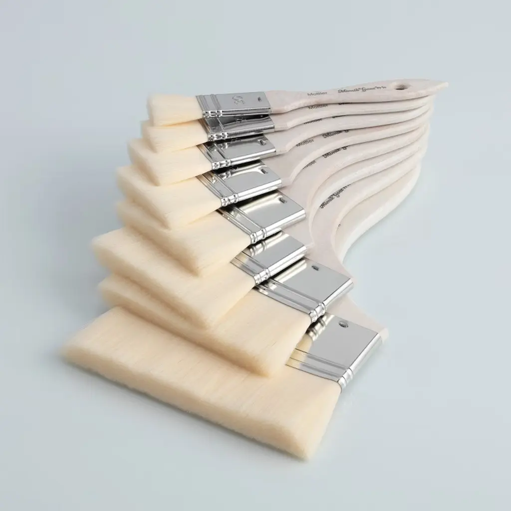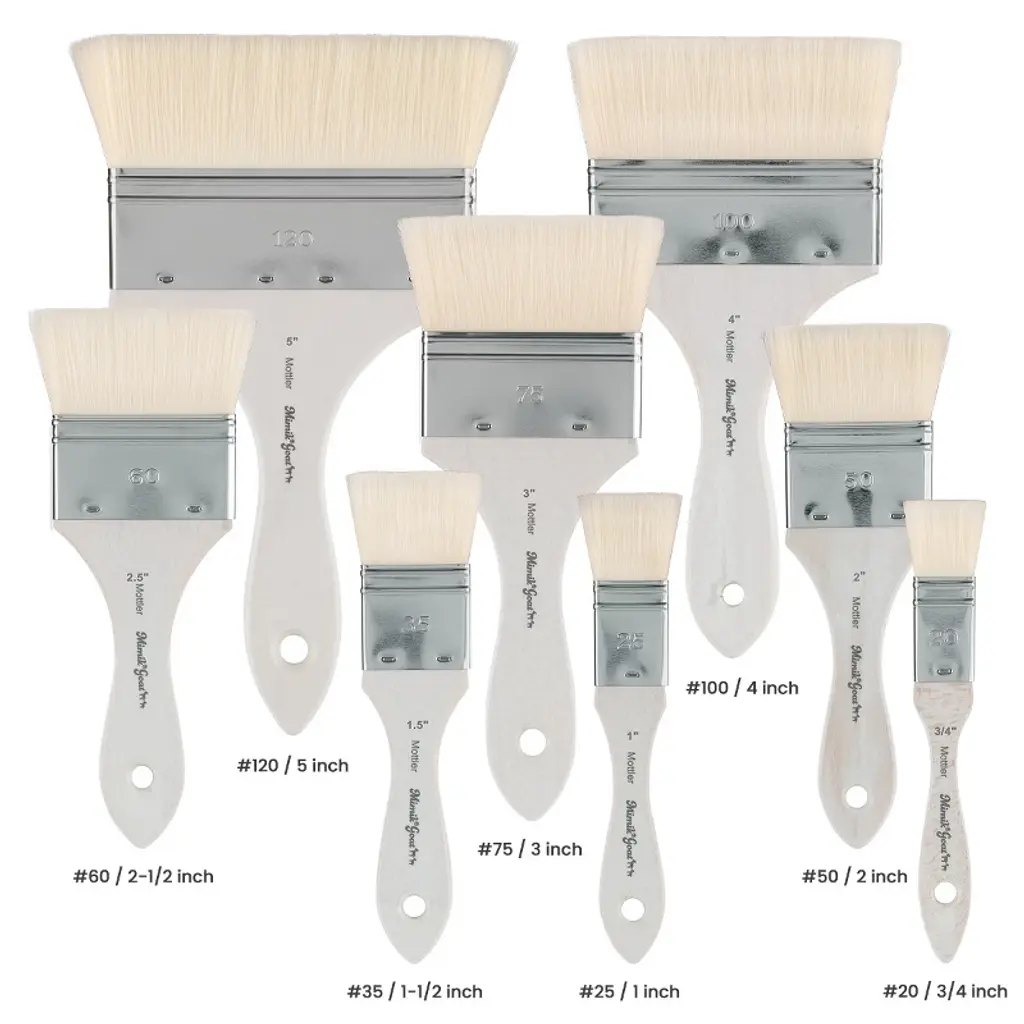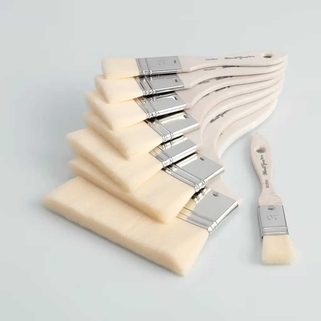 Introducing the Mimik Synthetic Goat Mottler Short Handle Paint Brush, an exceptional tool designed to meet the versatile needs of artists. This cruelty-free artist brush is a must-have for any artist's toolkit, providing superior performance across various mediums, including oil, acrylic, and watercolor. The Mimik brand is synonymous with excellence, and this brush exemplifies that reputation through its innovative design and exceptional functionality. Crafted to mimic natural goat hair, this synthetic paint brush offers the softness and absorbency that artists seek in a watercolor brush. The filaments are exceptionally soft and thin, ensuring a consistent, even application with minimal brush marks. Whether you're working with acrylic large paint brushes or need a fluffy paint brush for delicate blends, this brush adjusts seamlessly to any surface texture. Its absorbent filaments soak up and hold watercolor well, making it an ideal choice for large washes of color, blending paint, or applying glazes. One of the standout features of this brush is its durability. It is more break and tear-resistant than natural goat hair, providing longevity and reliability in your artistic endeavors. The rust-proof nickel-plated ferrules prevent hairs from coming out while painting. The short, durable handles are made from FSC-certified beech wood, providing a comfortable grip and excellent control. Each brush is handmade in Germany, a testament to its exquisite craftsmanship. This synthetic artist paint brush is not only perfect for watercolor but also excels as a blending brush for acrylic painting. Its versatility makes it suitable as a gesso brush, varnish brush, or even a flat bristle paint brush. Artists will appreciate its ability to handle large dabbing techniques, making it a valuable addition to any collection of large brushes for acrylic painting.