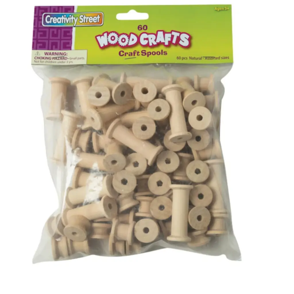 Creativity Street Wood Craft Spool Assortment contains a range of sizes from 1/2 inch to 2 inches. Spool features smooth-sanded, tough wooden material that allows to stack, string or count them. Spool is unfinished and ready for staining, painting and coloring with various mediums. Hardwood spool in assorted lengths can be used even as wheels and comes in a resealable bag which is sold as 60 per set.