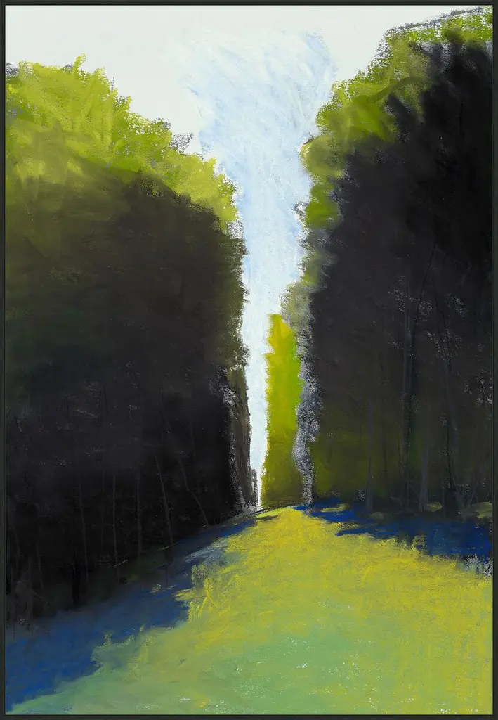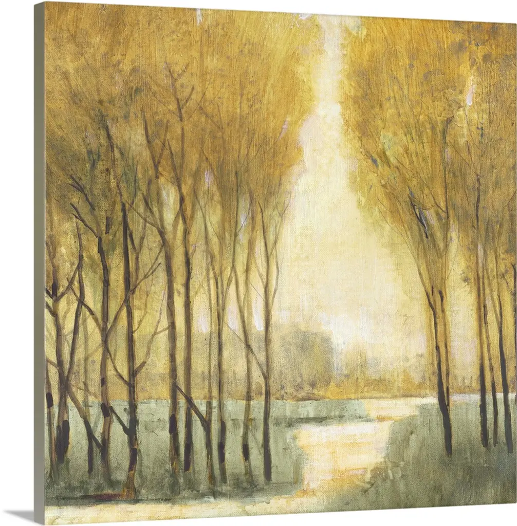 Neat brushstrokes together with a powerful rendering of sunset tones - rich plum, orange, purple, and mustard - lend this acrylic on canvas painting its antithetical charm. Depicting the setting of the sun from behind a grove of trees only interrupted by a couple of buildings, it shows how a seductive and a melancholic spirit can effortlessly coexist.