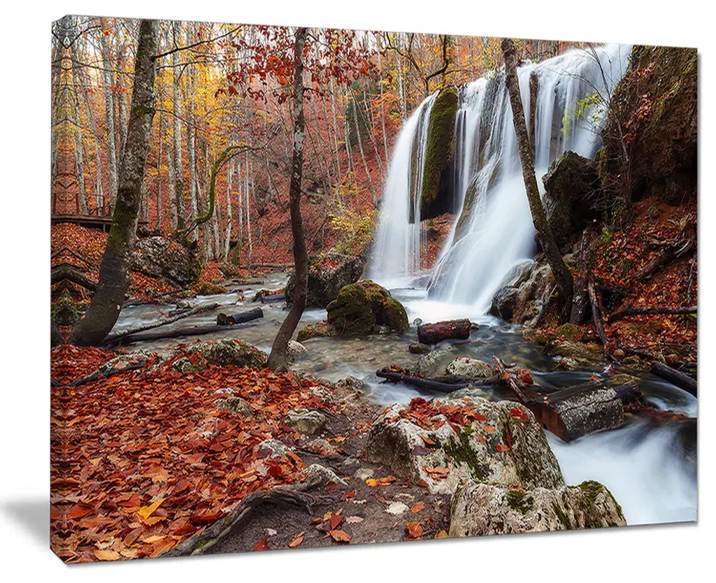 Bring contemporary abstraction to your home with this large 36W x 28H Metal Wall Art. This Crimea Waterfall in the Fall Metal Artwork makes it the focal point of any room or office. - White gloss coating ensures colors are extra vibrant with light reflection.- Aluminum grade sheet metal with 1-inch mounting frame on the back giving the illusion that the artwork is floating on the wall.- Mounting brackets are included along with instructions.- High quality digital images are created directly into a glossy aluminum panel producing a stunning and captivating print into the glossy finish of the metal.- Water, fire and scratch resistant HD aluminum panels.- Looks better than any photo paper and guaranteed to last at least 20 years- Easy to clean with a microfiber cloth. Colors are far superior to regular canvas art. - Easy to hang