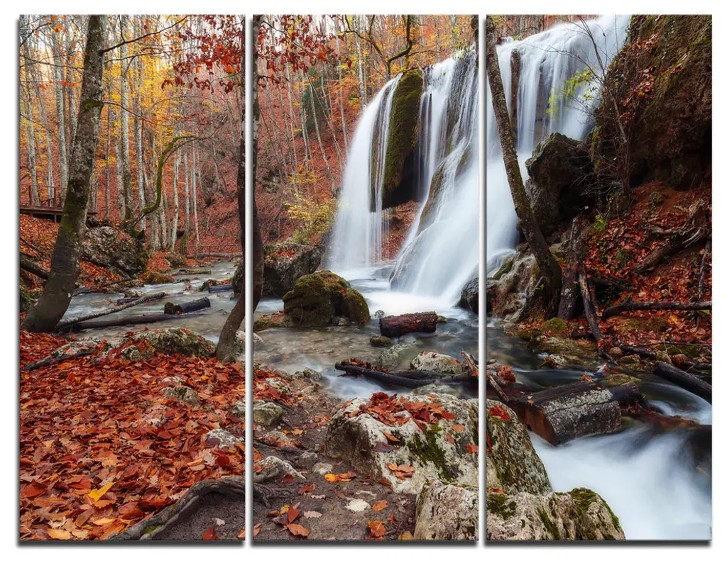 "Crimea Waterfall In The Fall" Photo Metal Wall Art, 3 Panels, 36"x28"